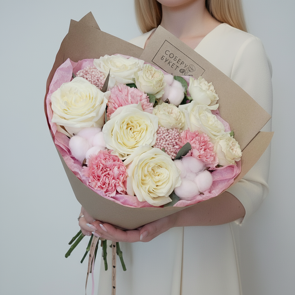 Представляем вашему вниманию эксклюзивный авторский букет из роскошных пионовидных роз, элегантной гвоздики и пушистого хлопка. Это настоящее произведение искусства, созданное нашими талантливыми флористами специально для вас! Такой подарок станет ярким акцентом любого праздника и подарит море положительных эмоций тому, кого вы цените и любите. Закажите у нас авторский букет прямо сейчас и порадуйте своих близких великолепным подарком!