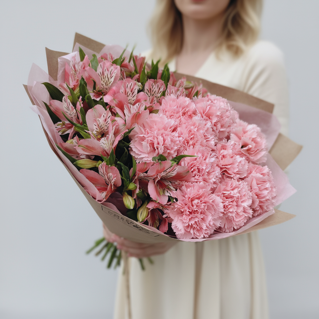 Почувствуйте весеннее настроение вместе со свежим букетом от «Цветочной долины»! В нём гармонично сочетаются элегантные альстромерии и романтические розовые гвоздики. Идеальный подарок для любимой женщины по любому поводу. Помните, что цветы – это лучший способ выразить свои чувства ! Альстрамерия и розовые гвоздики