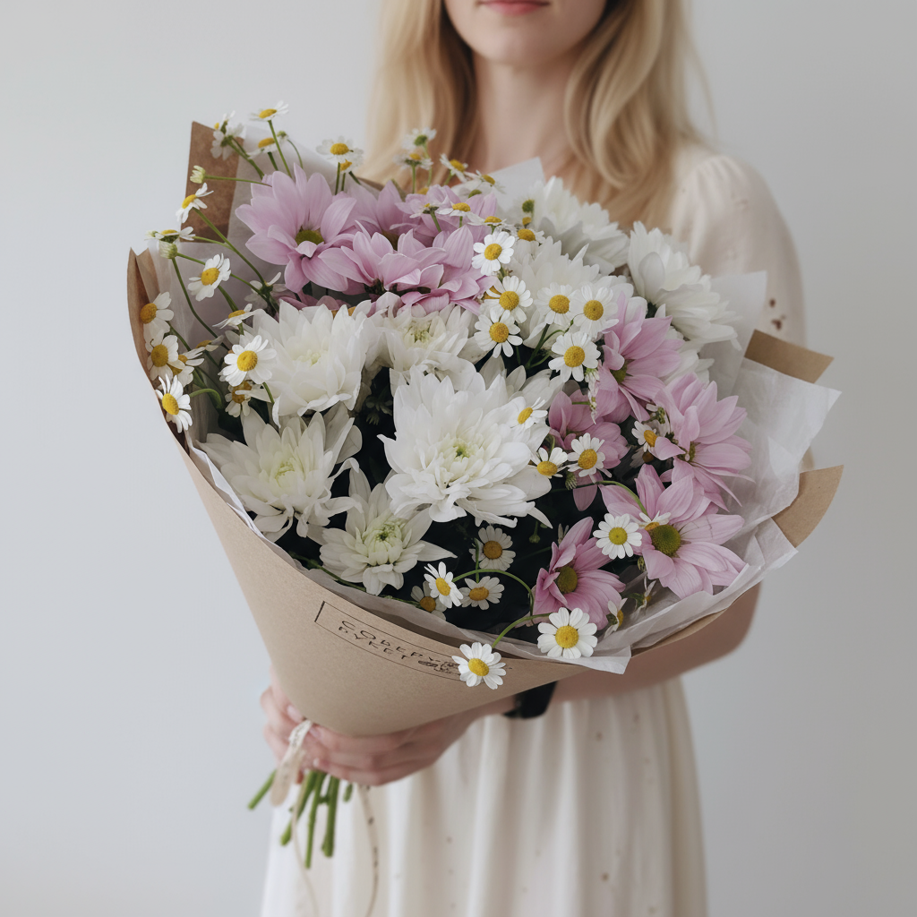 Представляем вашему вниманию очаровательный букет из свежесрезанных кустовых хризантем и милых сердцу полевых ромашек! Эти цветы наполнят ваш дом ароматом летнего луга и подарят ощущение тепла даже в самый пасмурный день. Будь то подарок близкому человеку или украшение вашего дома – наш букет станет идеальным решением. Посетите наш магазин уже сегодня и окунитесь в мир красоты и вдохновения вместе с нами!