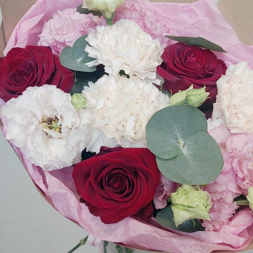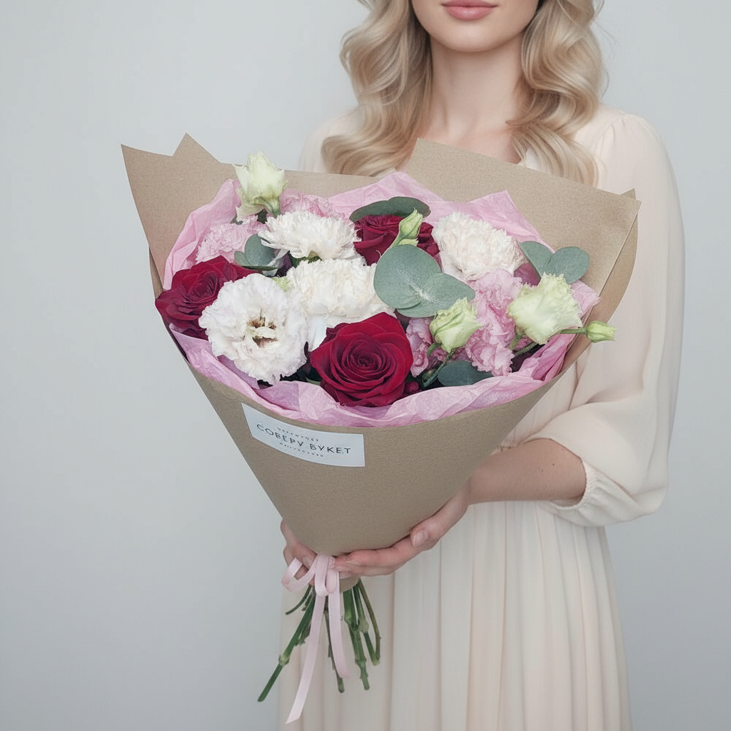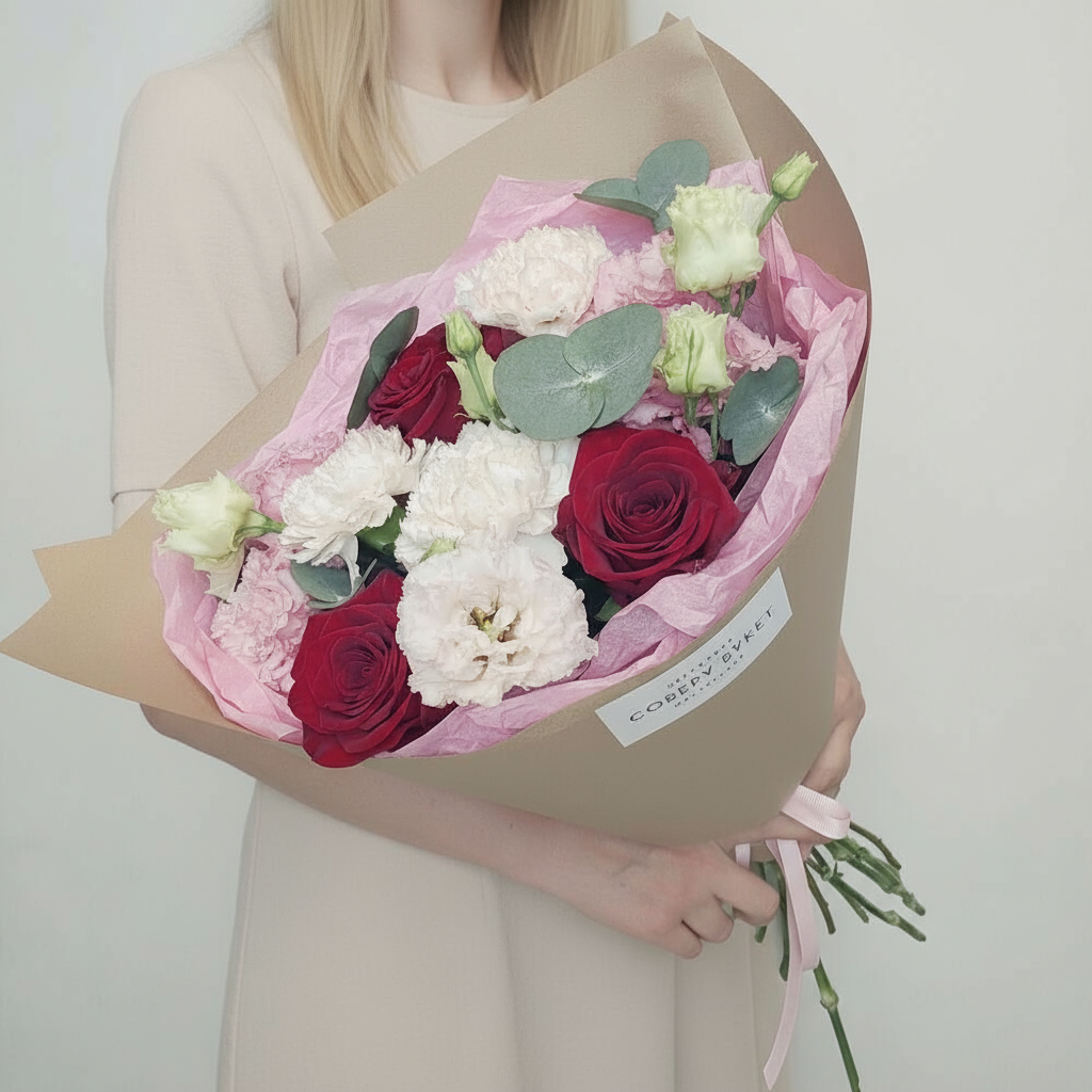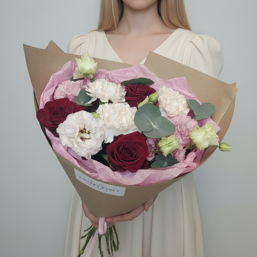 Почувствуйте благоухание страсти вместе со знойными красавицами от флористов нашего салона! Роскошная гвоздика кремовых оттенков, элегантная эустома цвета утренней зари, алая как пламя роза Red Naomi и таинственный эвкалипт – это букет, который расскажет о ваших чувствах без слов. Утоните в море эмоций и позвольте этим цветам стать вашим личным посланием любви. Заказывайте уже сегодня и наслаждайтесь красотой и ароматом наших творений!