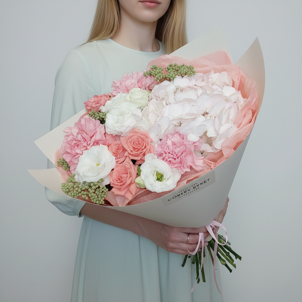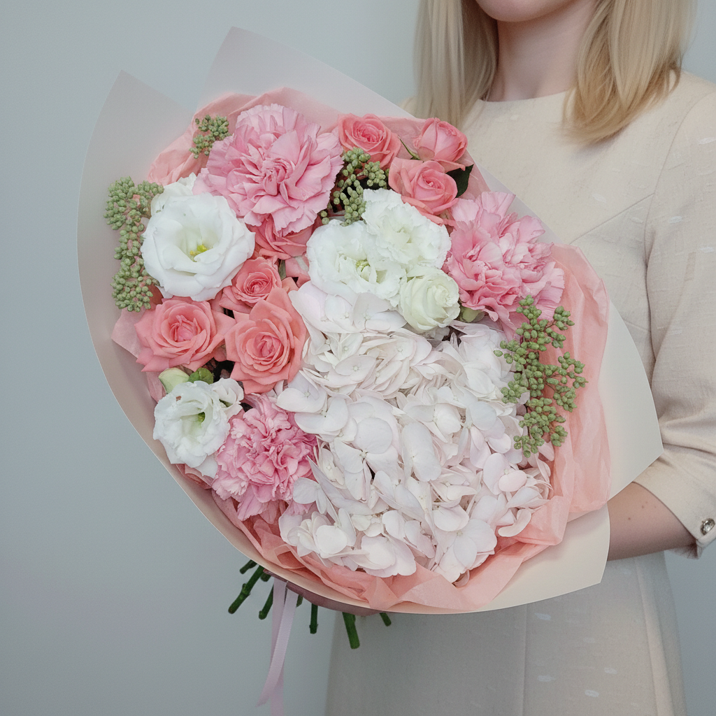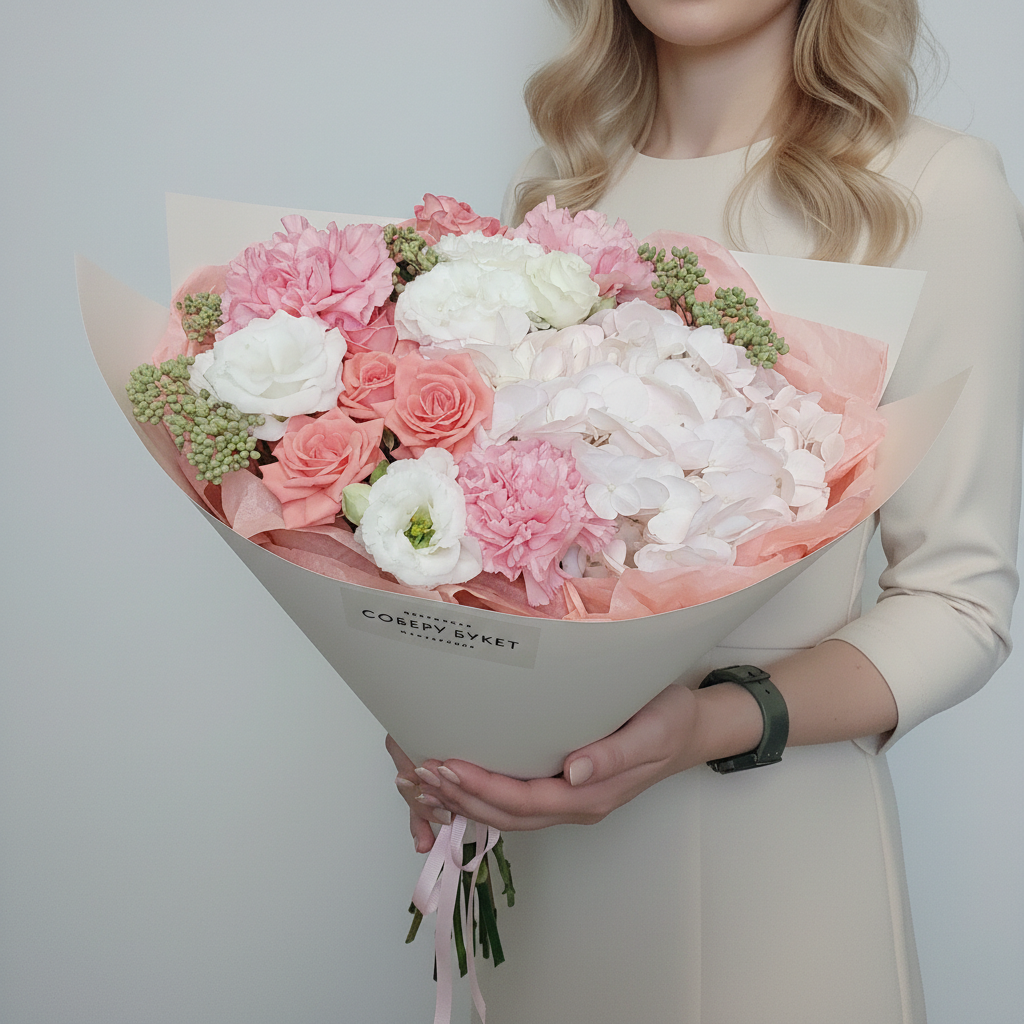 Почувствуйте гармонию природы в каждом лепестке авторского букета от нашего цветочного магазина! Гортензия, кустовые розы, элегантная эустома и благородные гвоздики собраны воедино нашими талантливыми флористами, чтобы поразить вас своей красотой и ароматом. Этот букет станет прекрасным подарком к любому празднику или просто поднимет настроение без повода. Авторские букеты – это уникальное сочетание качества, стиля и любви к цветам. Удивите своих близких эксклюзивным презентом уже сегодня!