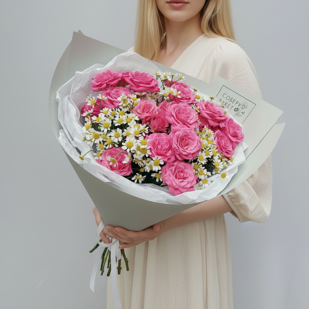 Букет из кустовых малиновых роз и полевых ромашек – это идеальное сочетание красоты и нежности. Он станет великолепным подарком для вашей возлюбленной, подчеркивая ваши чувства к ней. Закажите его прямо сейчас!
