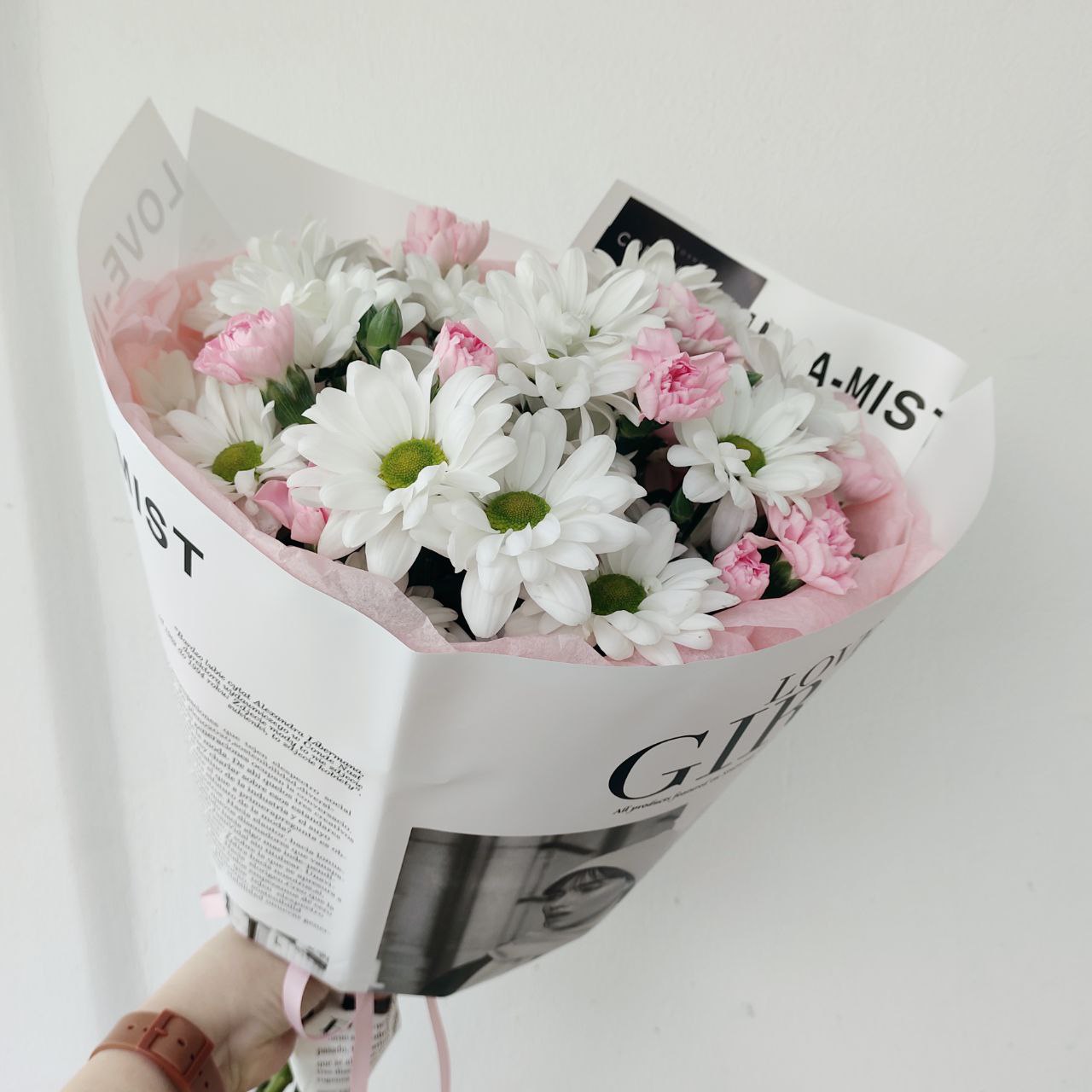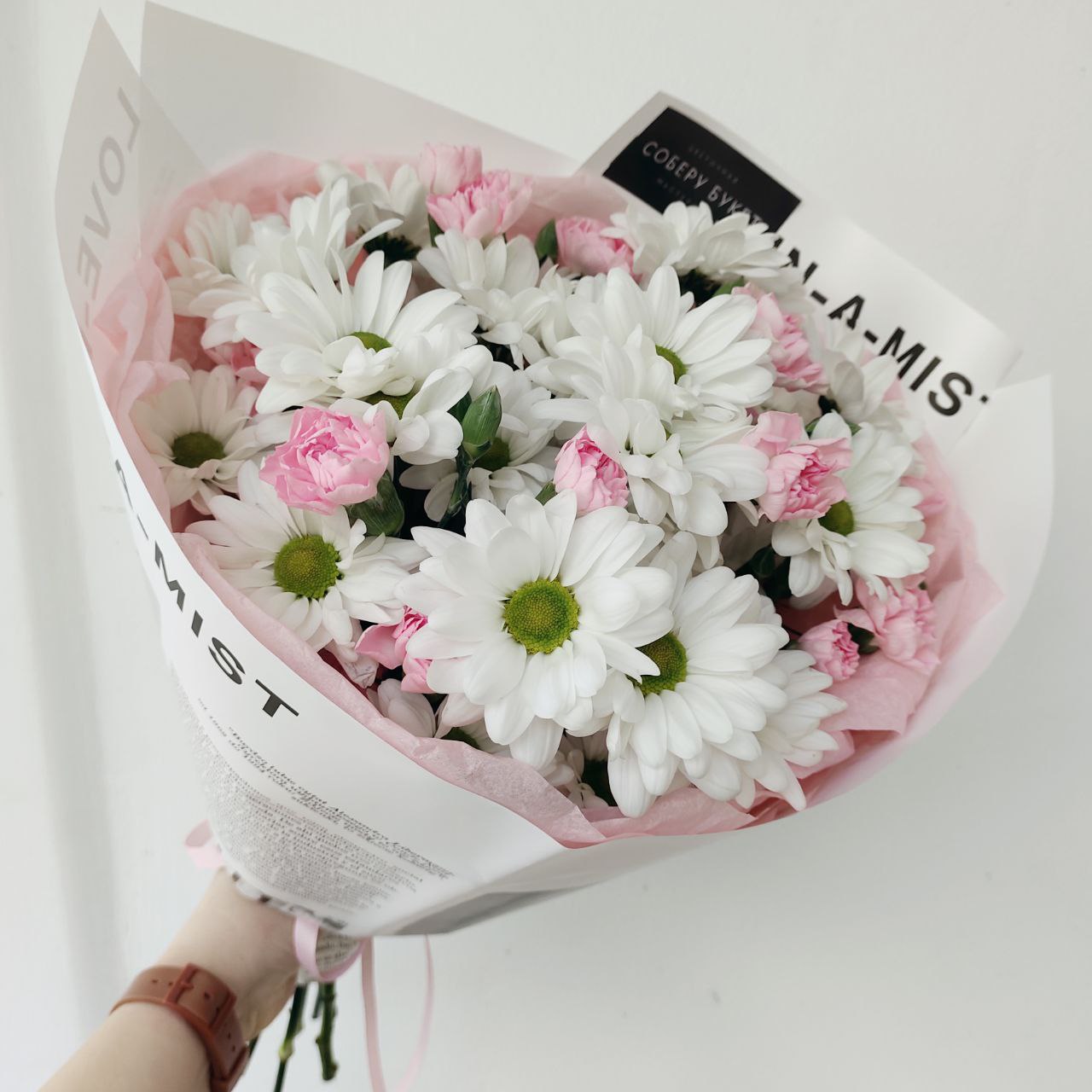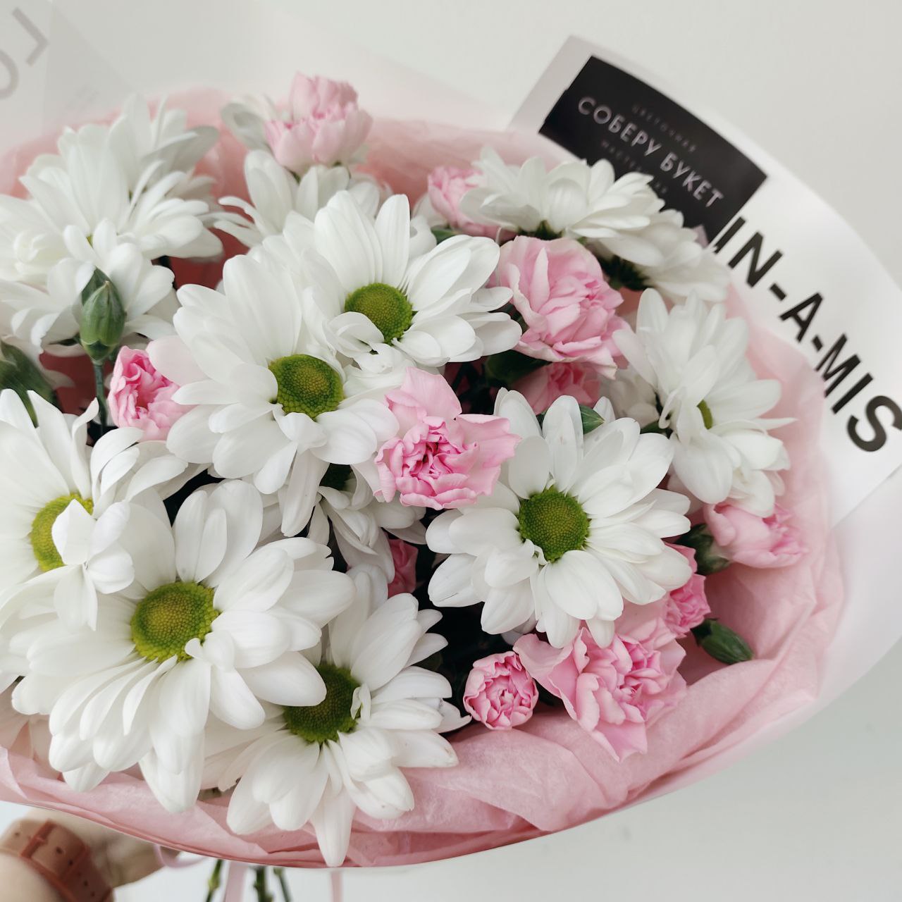 Розовые кустовые гвоздики с ромашковой хризантемой. Прекрасный розовый букет, который станет ярким акцентом любого мероприятия! В него вошли нежные кустовые гвоздики и изящная ромашковая хризантема. Сочетание оттенков розового создаст атмосферу романтики и уюта. Это идеальный букет для тех, кто ценит элегантность и простоту!