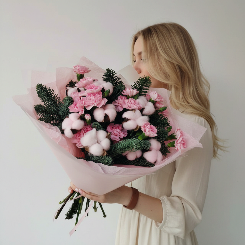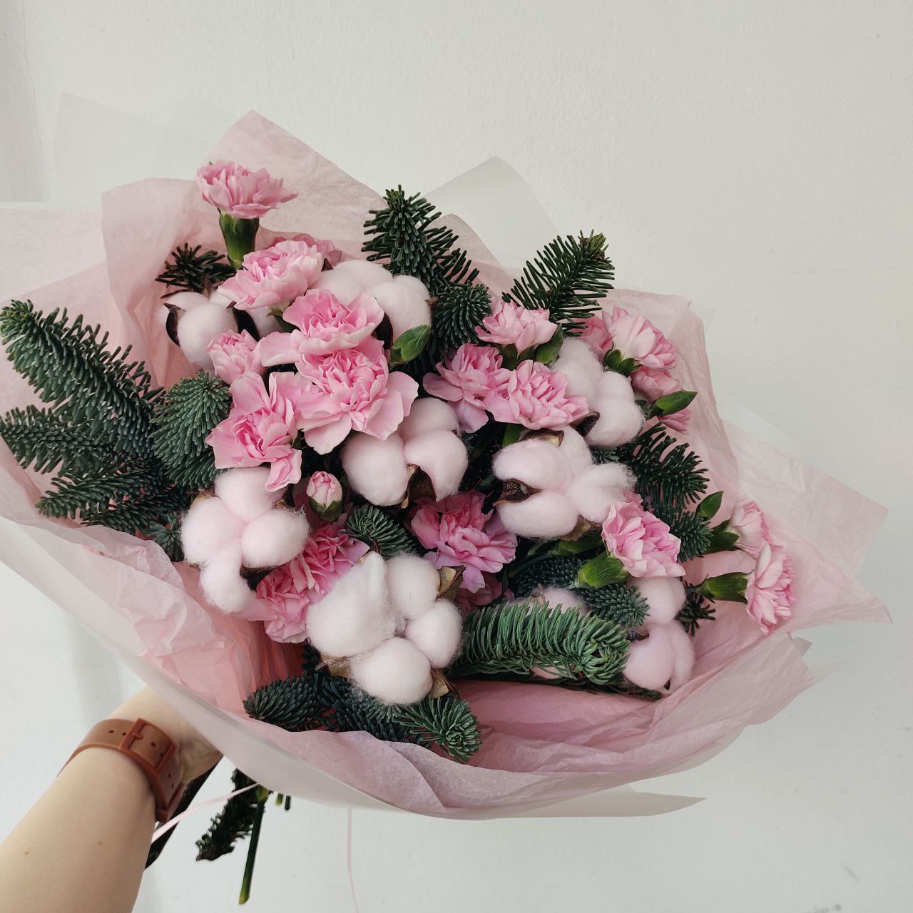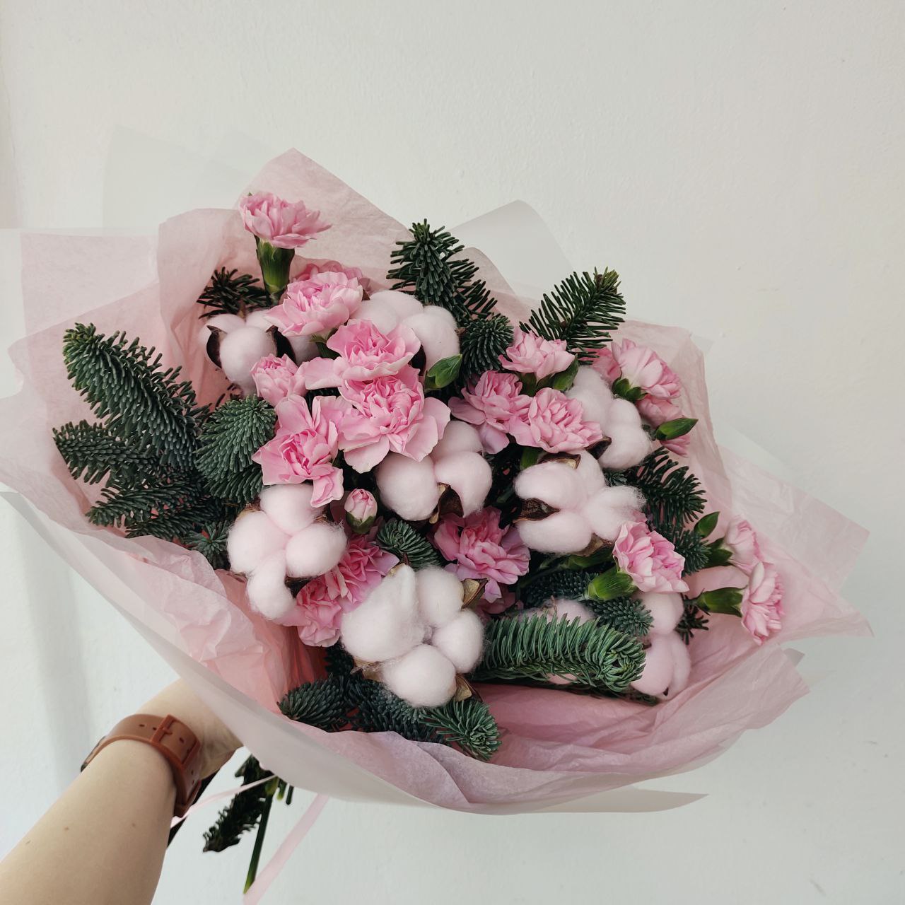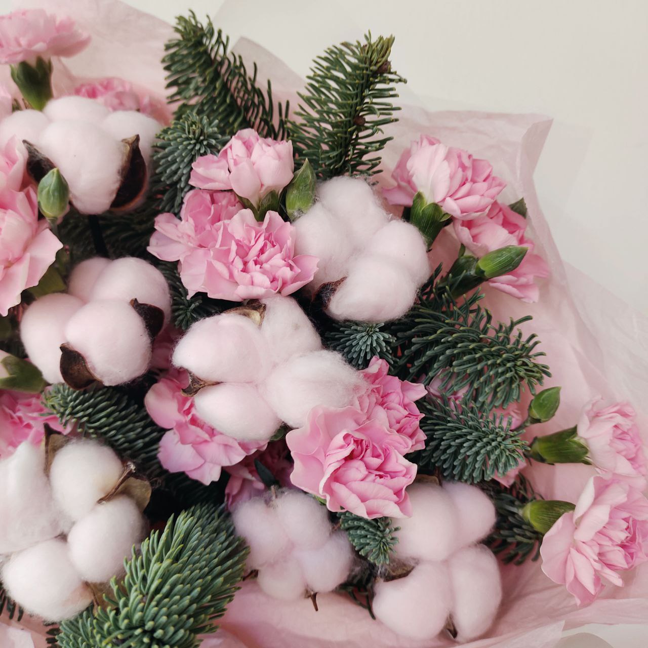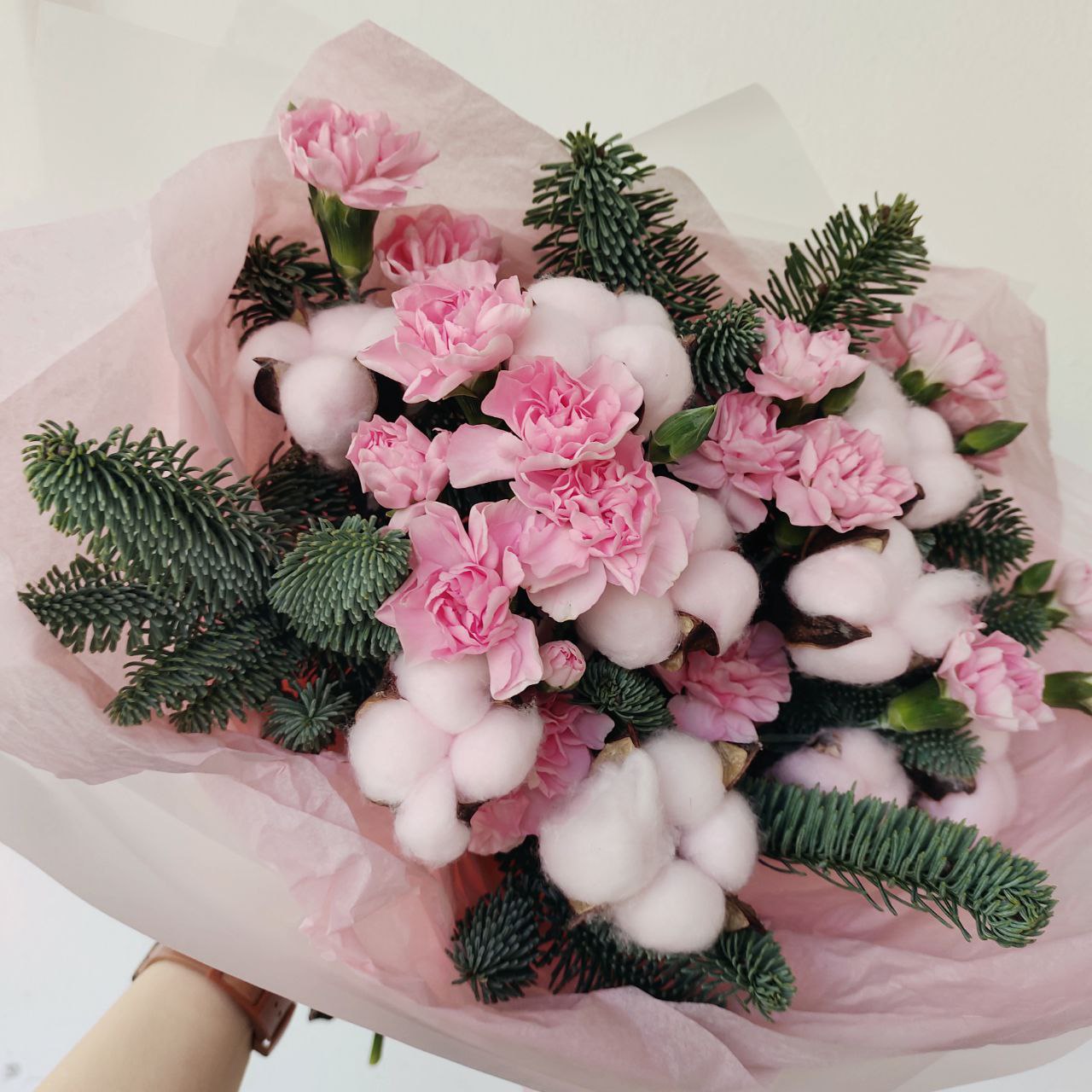 Розовые кустовые гвоздики с нобилисом и хлопком. Прекрасный выбор для тех, кто ценит элегантность и классику! Наши свежие кустовые гвоздики в сочетании с ароматной елкой и хлопком, создадут атмосферу уюта и тепла. Этот букет станет отличным подарком к празднику или просто знаком внимания для близких людей. Закажите сейчас и порадуйте своих любимых яркими красками природы!