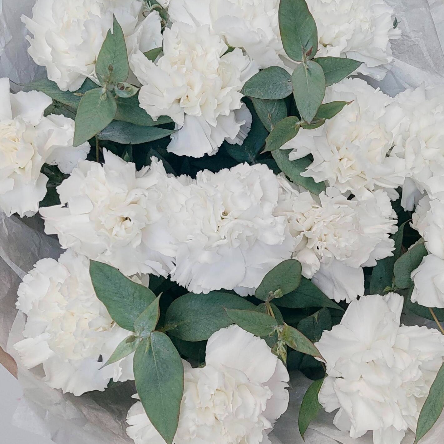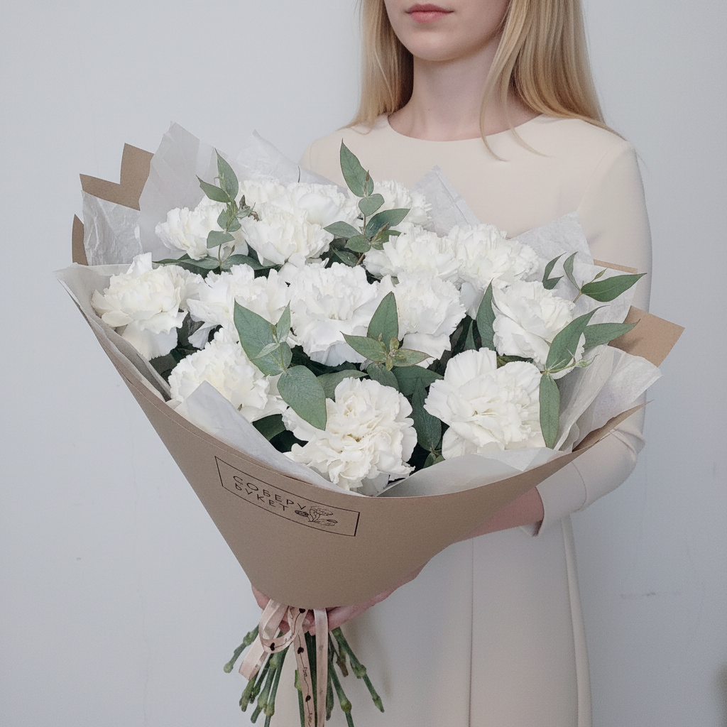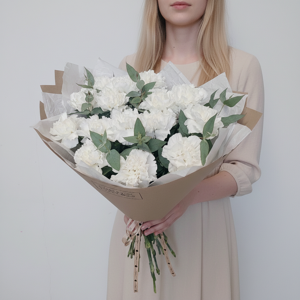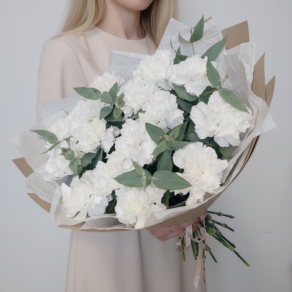 Представляем вам новый тренд флористической моды! Изысканный букет «Белая классика» из 15 восхитительных белоснежных гвоздик подчеркнёт ваш безупречный вкус и станет прекрасным подарком к любому торжеству. Элегантный эвкалипт придаёт композиции особую свежесть и шарм. Подарите радость вашим близким вместе с «Белой классикой»!