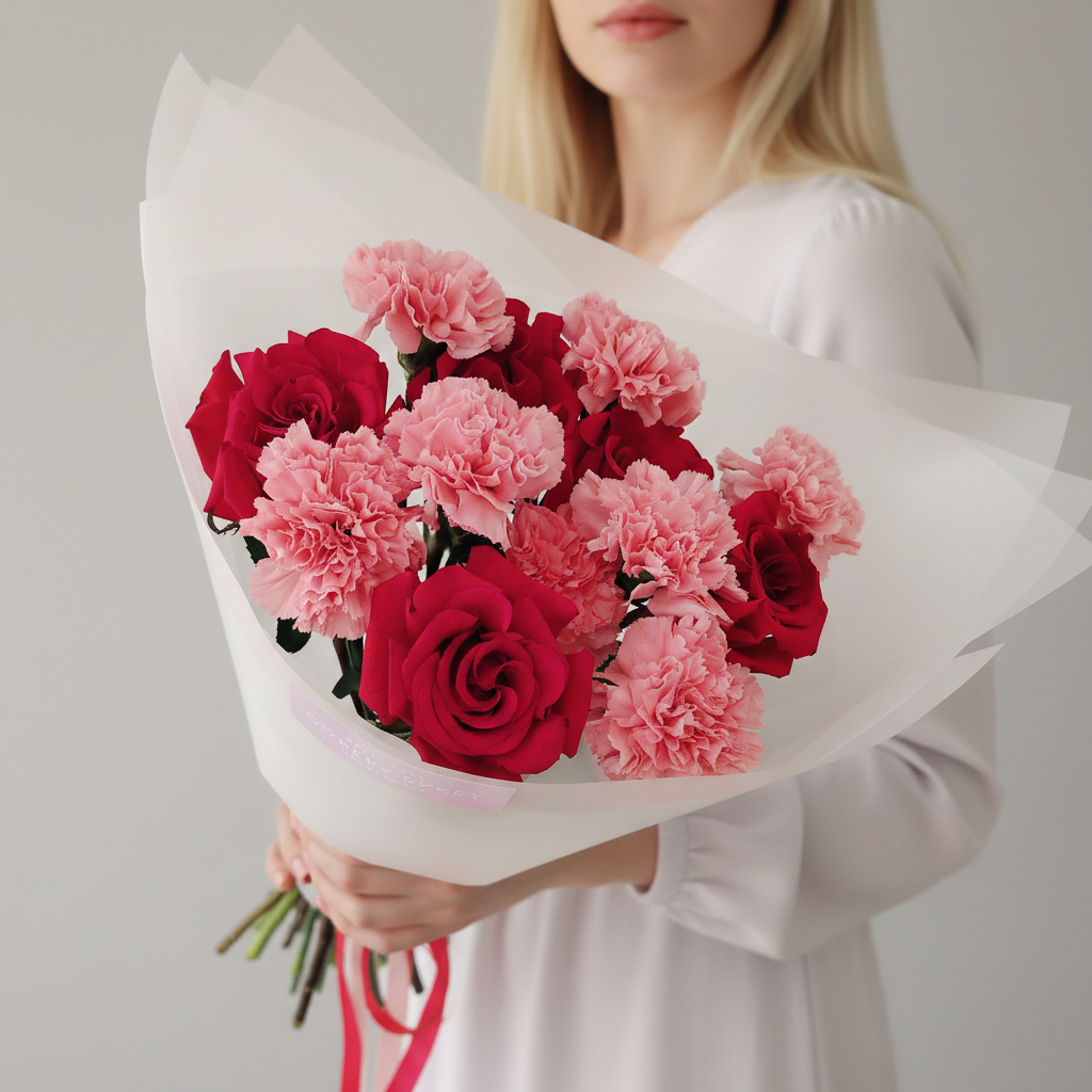 Представляем вашему вниманию роскошные красные розы и розовые гвоздики, собранные в элегантный букет. Этот восхитительный подарок станет прекрасным знаком внимания для ваших близких и родных людей! Наши цветы всегда свежие и ароматные – мы гарантируем высокое качество продукции. Порадуйте своих любимых великолепным букетом уже сегодня!