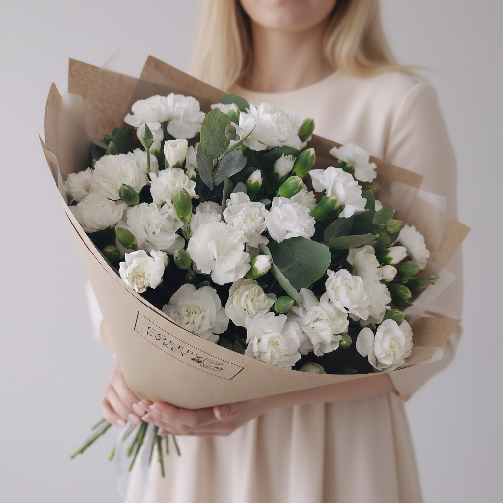 Почувствуйте всю нежность и трепетность этого момента, подарив близкому человеку очаровательный букет из 19 белых кустовых гвоздик и эвкалипта! Эти воздушные цветы наполнят сердце радостью и теплом, а тонкий аромат эвкалипта придаст моменту особую магию. Такой подарок станет прекрасным украшением любого праздника и напомнит о ваших искренних чувствах. Закажите этот великолепный букет прямо сейчас и сделайте незабываемым каждый момент, проведенный вместе!