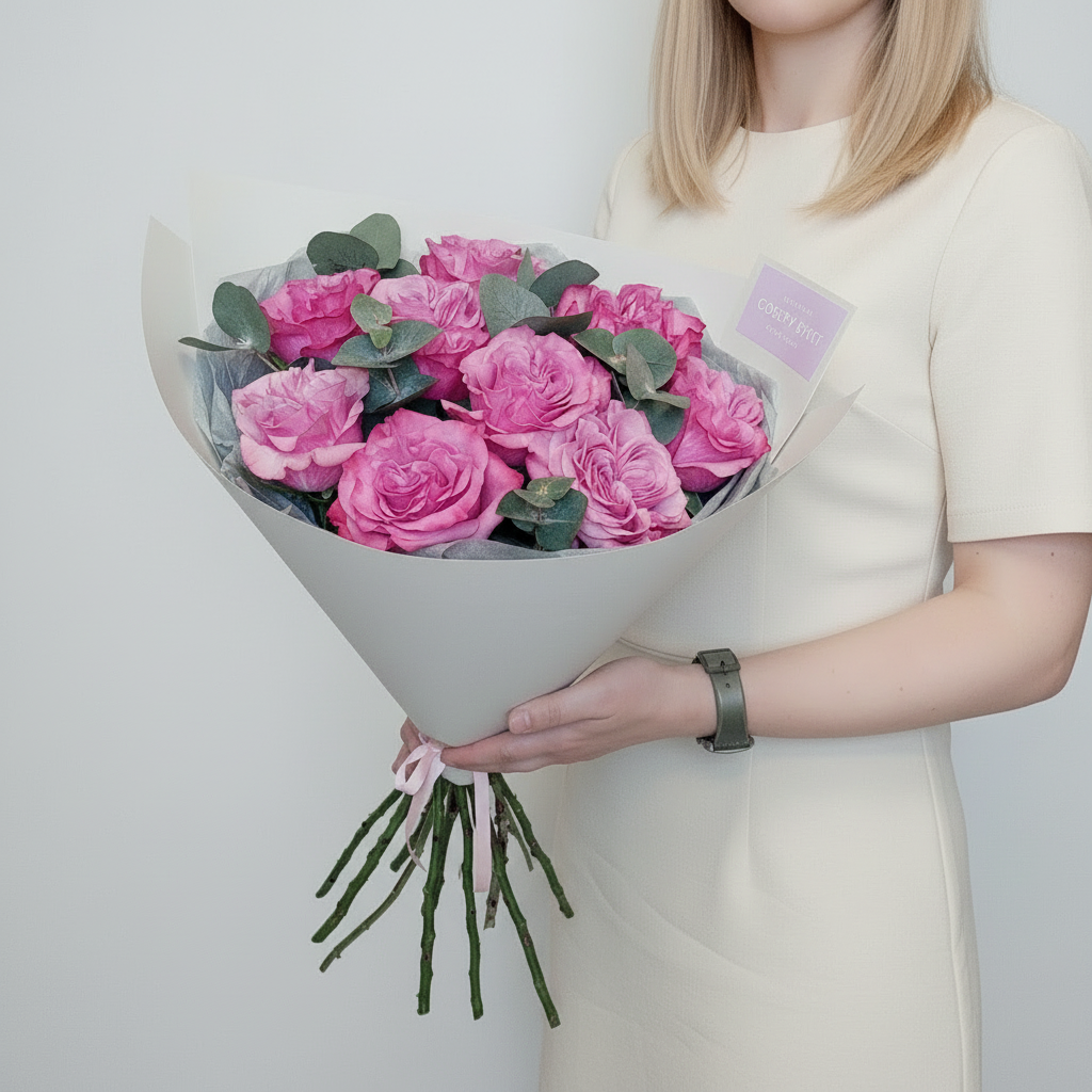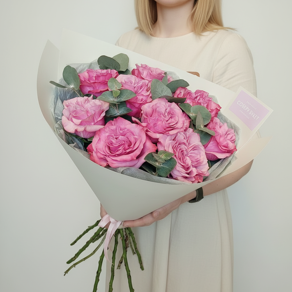 Почувствуйте благоухание страсти! Яркие бутоны пионовидных роз завораживают своей красотой, а свежий аромат эвкалипта пробуждает чувства. Этот великолепный дуэт станет прекрасным подарком вашей возлюбленной. Закажите прямо сейчас и порадуйте своих близких!