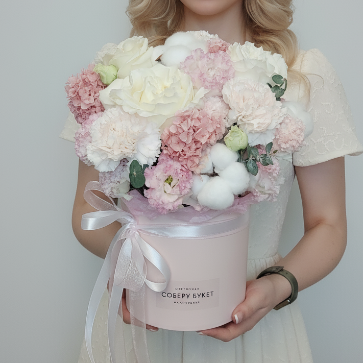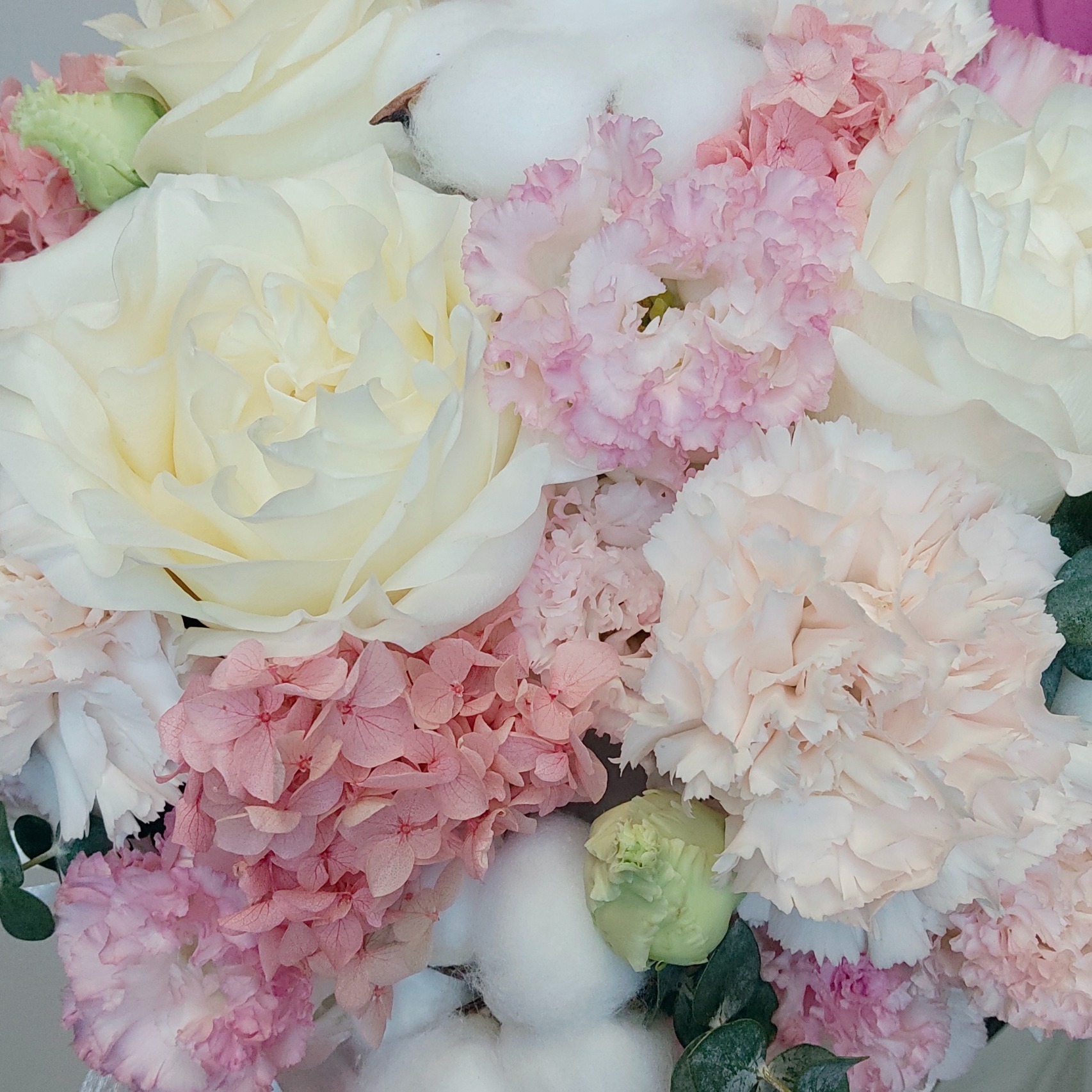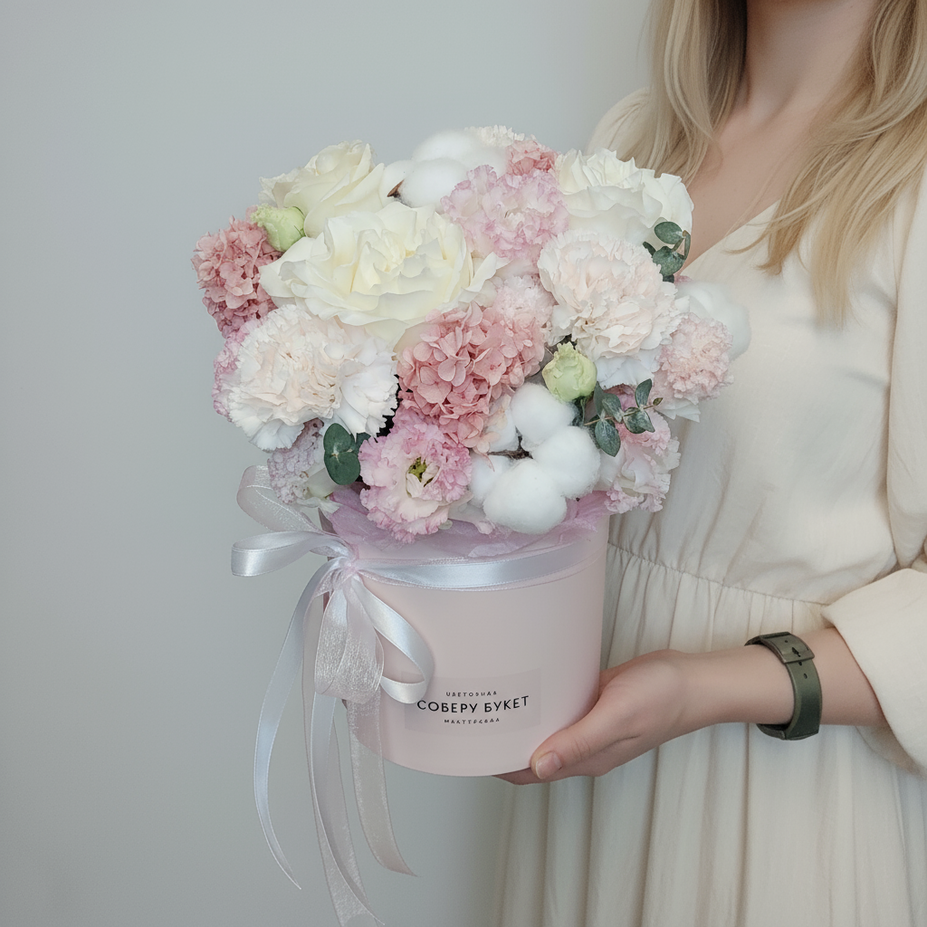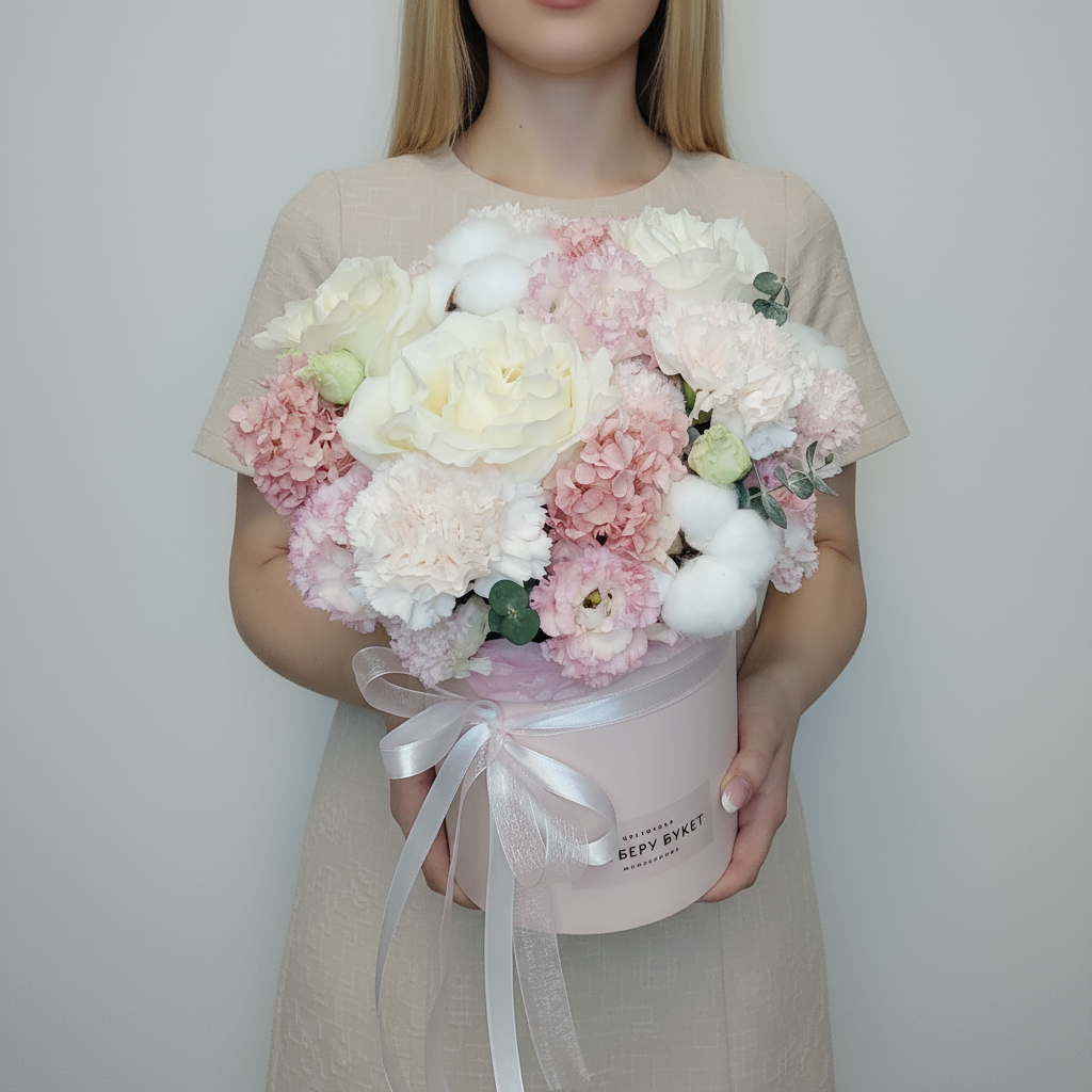 Представляем вашему вниманию композицию премиум-класса «Кремово-розовая симфония», который станет великолепным подарком по любому поводу! В составе композиции исключительно свежие цветы лучших сортов от мировых поставщиков флористической продукции: нежная гвоздика кремового оттенка, элегантная эустома розовых тонов, мягкий как пух хлопок, насыщенный зеленый эвкалипт, воздушная стабилизированная гортензия и необыкновенная импортная роза сорта Кенди Лайт. Эти прекрасные растения бережно собраны опытными руками наших талантливых мастеров-флористов, чтобы радовать вас и ваших близких своим роскошным видом и бесподобным ароматом долгое время. Будьте уверены – такой подарок запомнится навсегда!