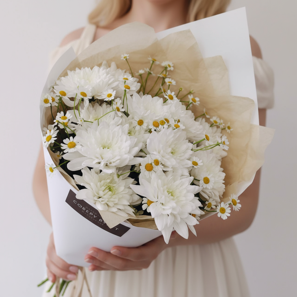 Почувствуйте тепло летнего луга вместе с нашим восхитительным букетом! Хризантемы и ромашки гармонично сочетаются друг с другом, создавая великолепную композицию, которая порадует глаз каждого ценителя природы. Этот свежий букет станет прекрасным подарком к любому случаю – будь то день рождения или просто знак внимания любимому человеку. Приходите в наш магазин цветов "Соберу букет" уже сегодня и наслаждайтесь красотой нашей флористической продукции!
