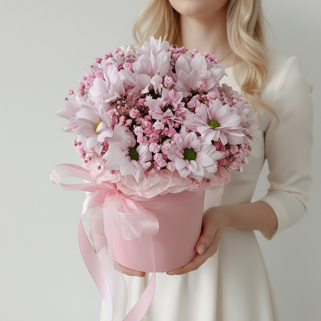 Почувствуйте нежность и теплоту природы вместе с нашей коробкой свежих цветов! Розовая гипсофила и ромашковая хризантема создадут атмосферу уюта и спокойствия в вашем доме. Этот прекрасный подарок подойдет для любого случая – дня рождения, юбилея или просто чтобы порадовать близких людей. Заказывайте сейчас и наслаждайтесь красотой каждого лепестка!
