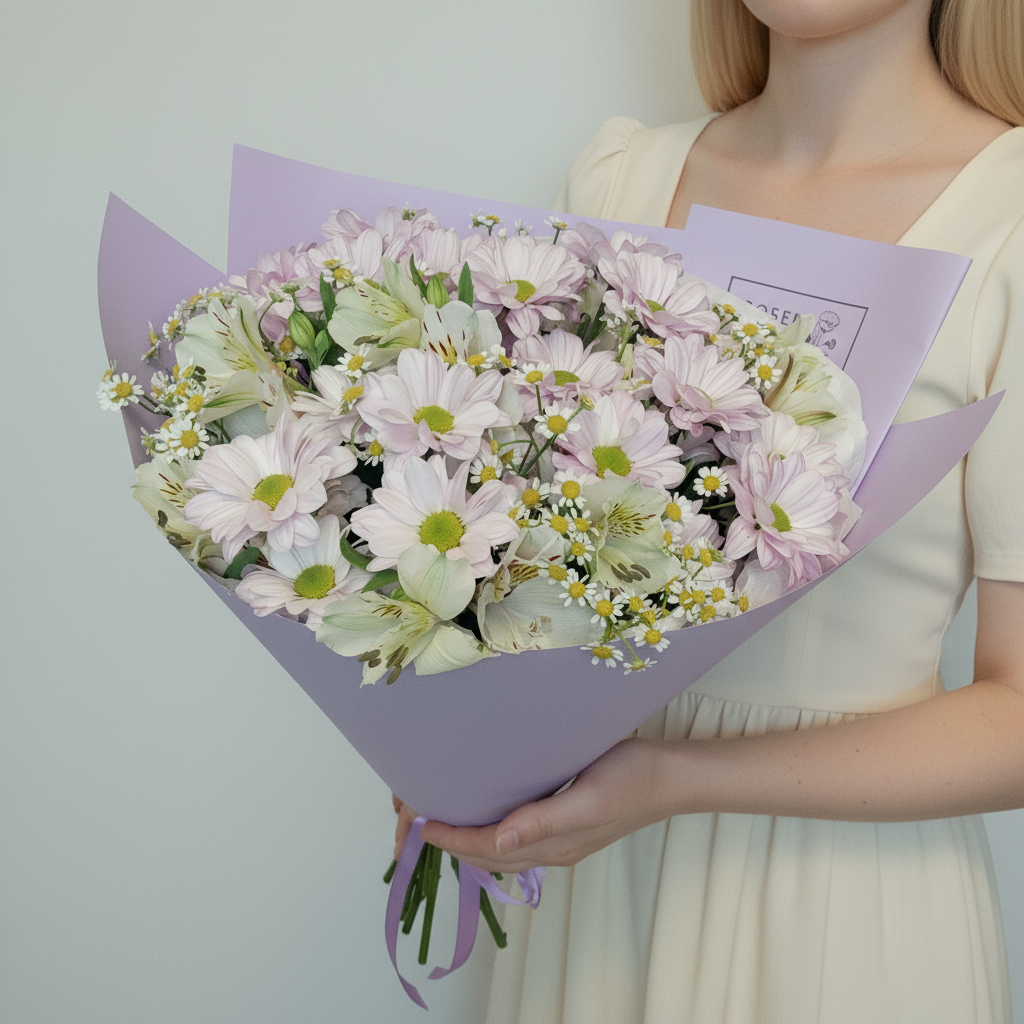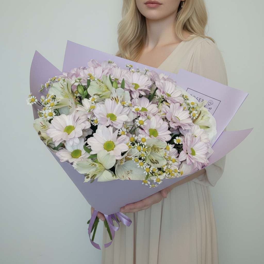 Полевые ромашки придают букету нотку свежести и простоты, а белая альстромерия добавляет элегантности и утонченности. Этот монохромный букет станет прекрасным подарком по любому поводу. Создайте настроение легкости и романтики с этим восхитительным полевым букетом!
