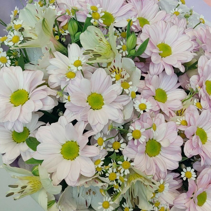 Полевой букет из розовой ромашковой хризантемы, полевых ромашек и белой альстромерии.