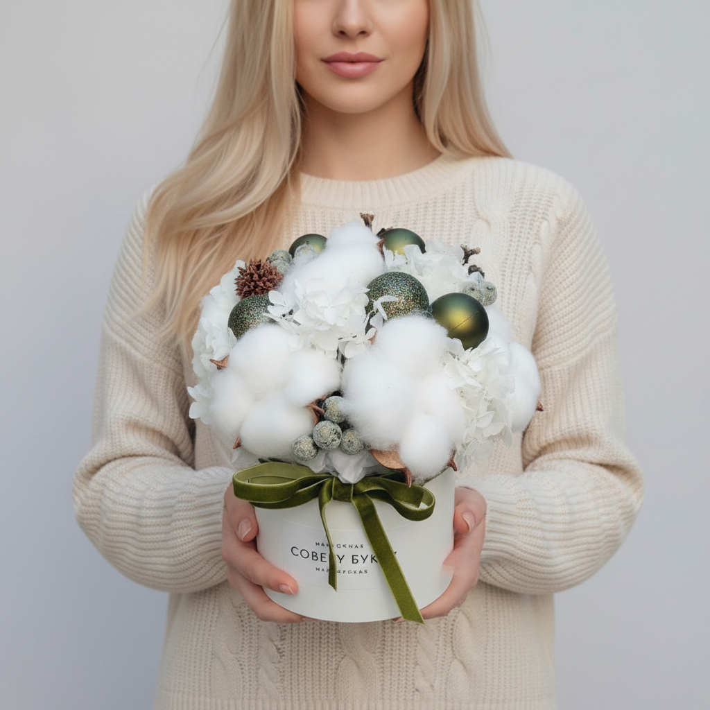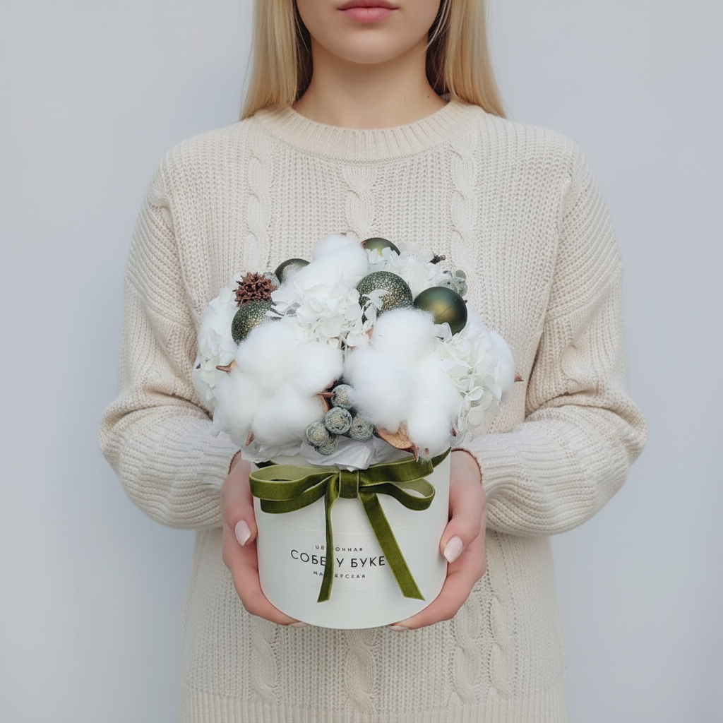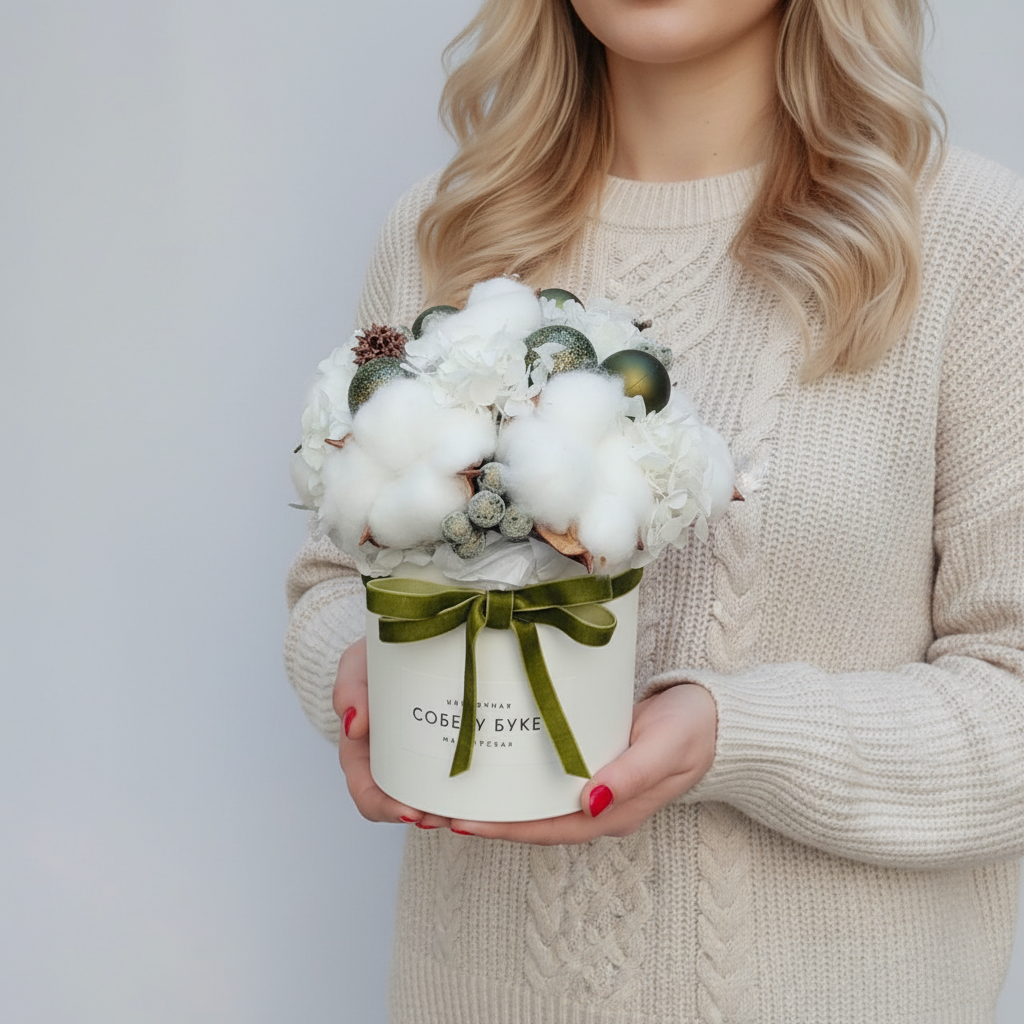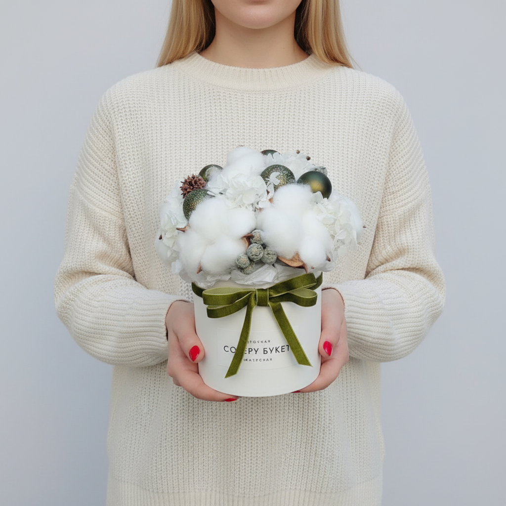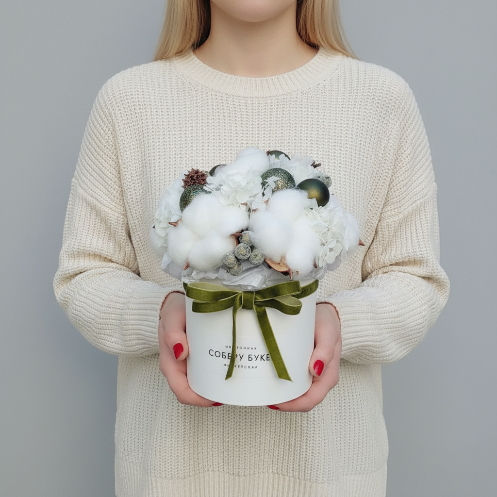 Шишки - 5 шт. Шляпная коробка - 1 шт. Елочные украшения - 7 шт. Губка флористическая - 1 шт. ягоды искусственные - 13 шт. гортензия стабилизированная - 1 шт. хлопок декоративный - 7 шт.