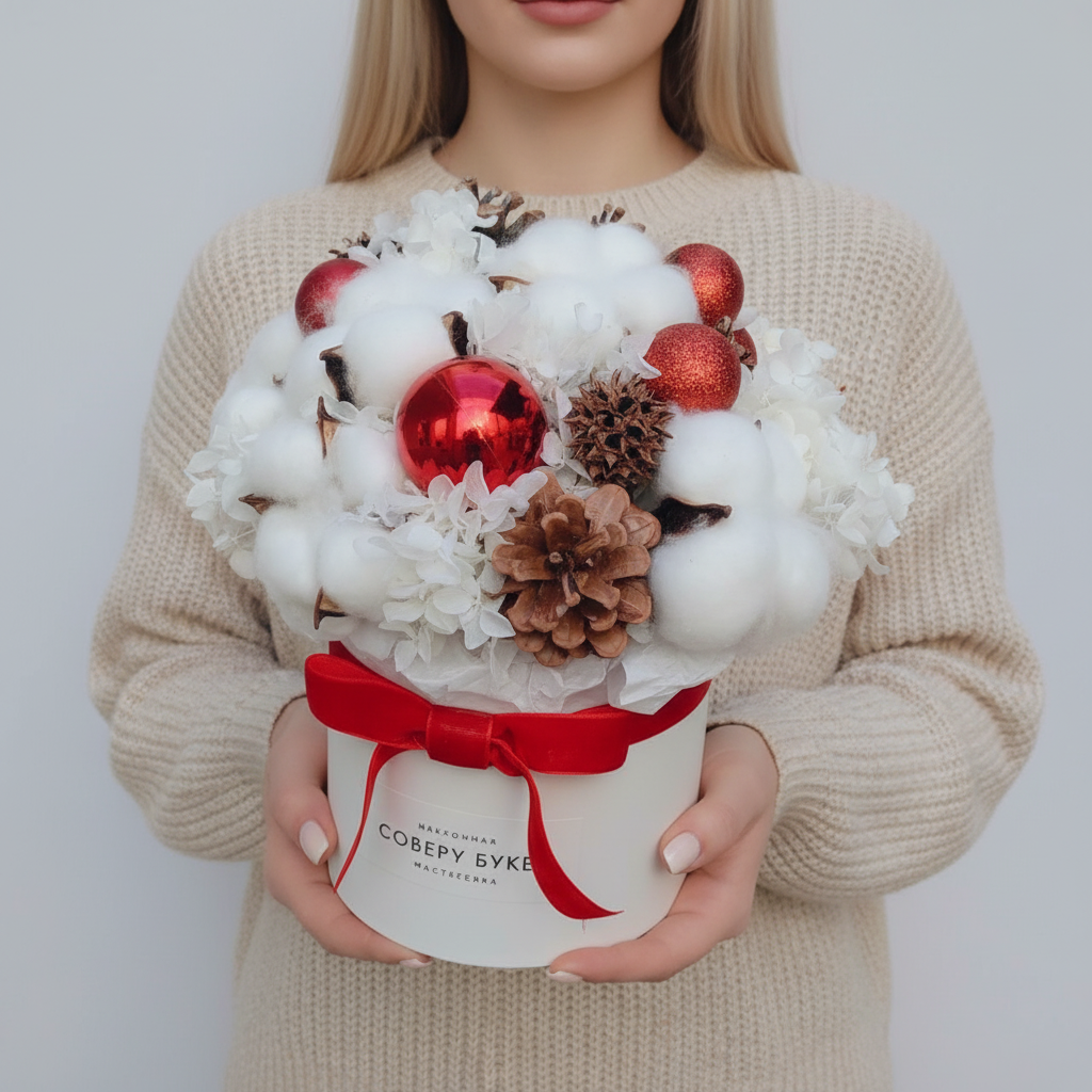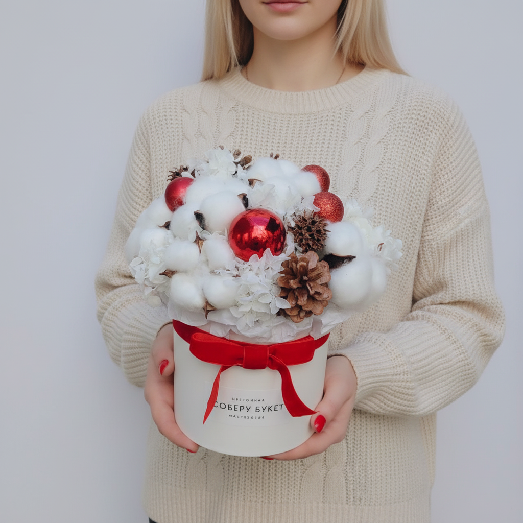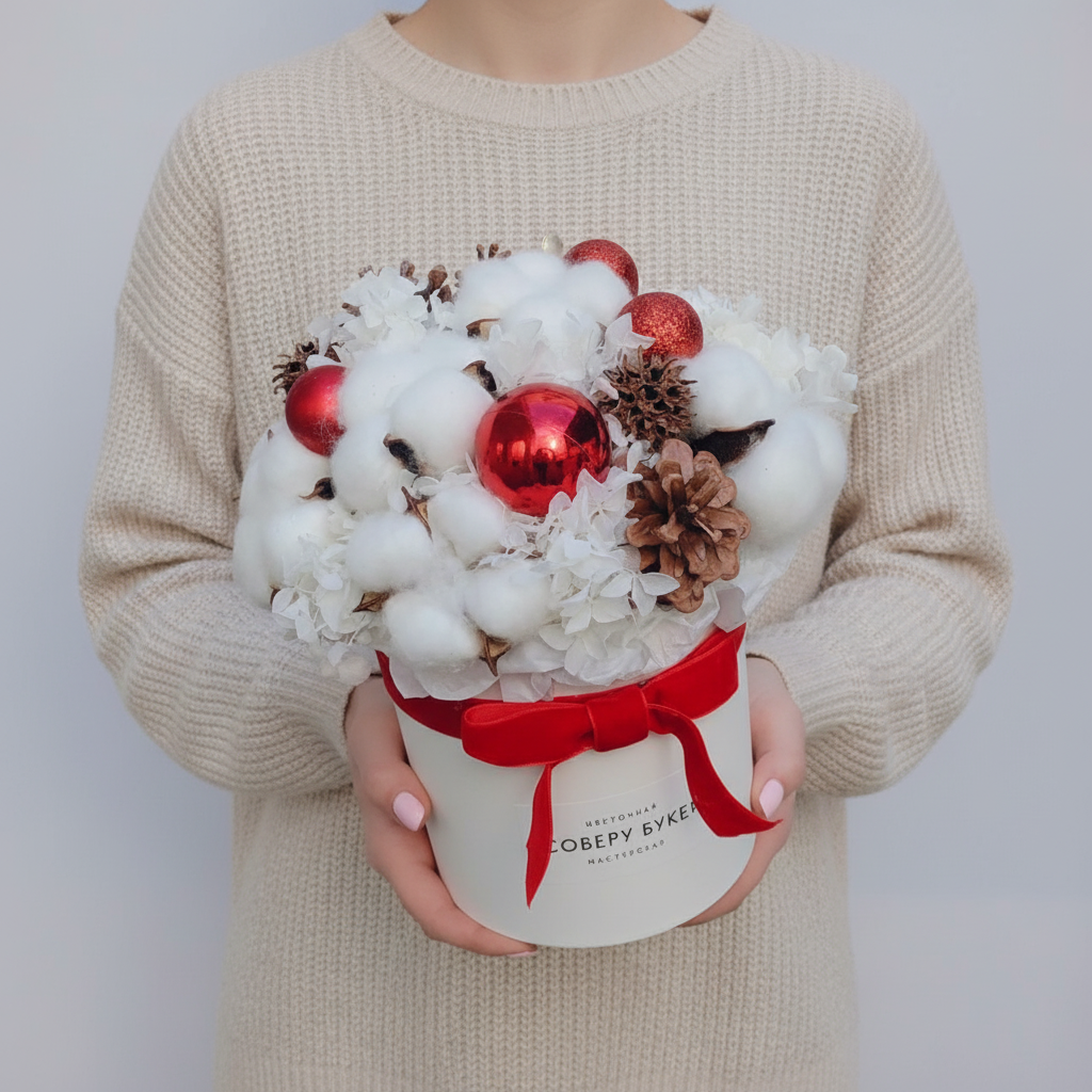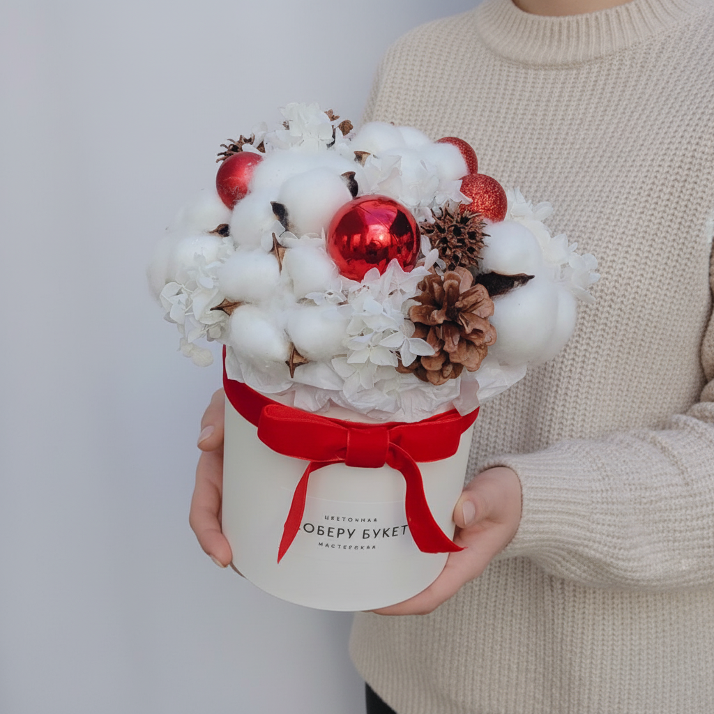 Шляпная коробка - 1 шт. Шишка сосновая - 3 шт. Елочные украшения - 8 шт. Губка флористическая - 1 шт. хлопок декоративный - 9 шт. гортензия стабилизрованная - 1 шт.