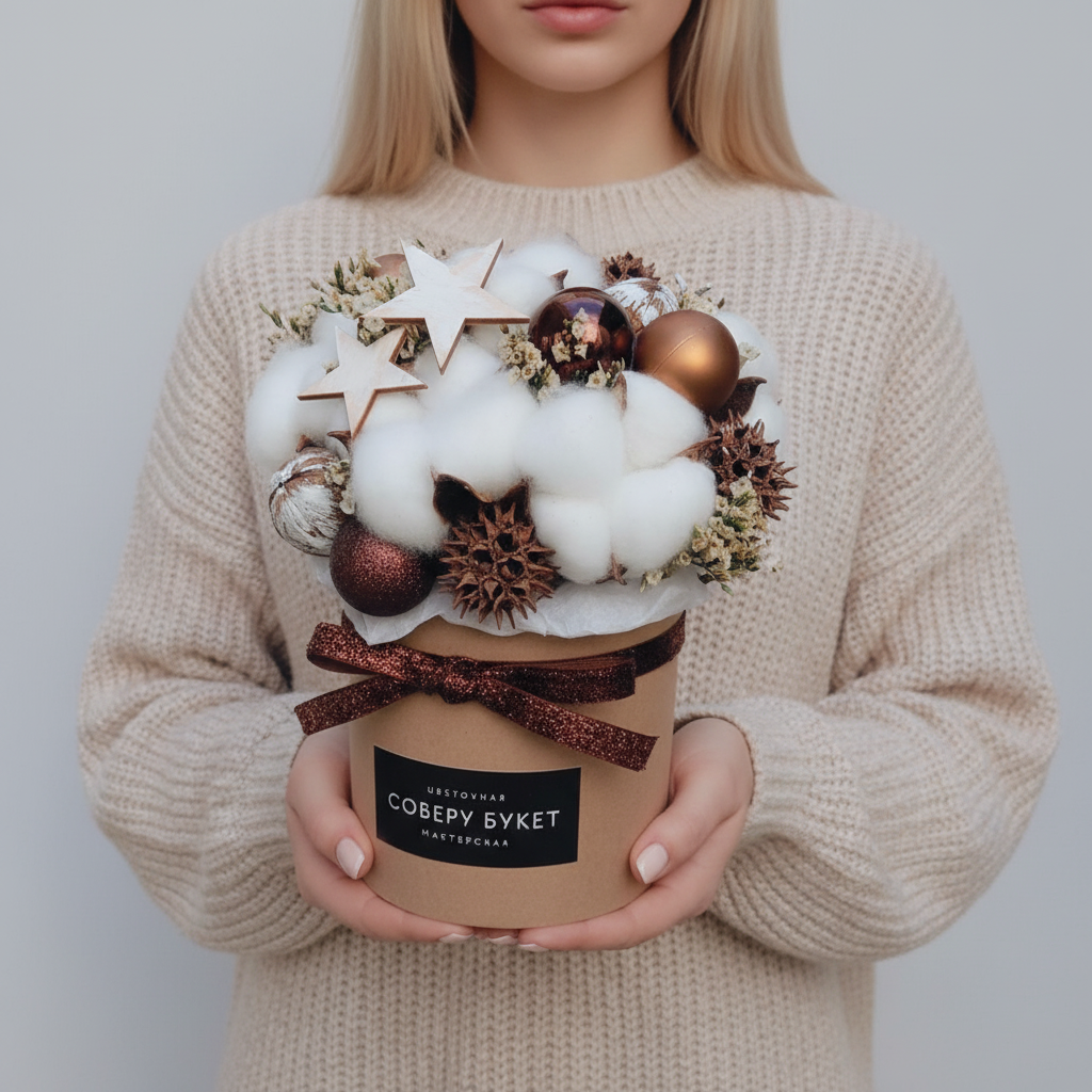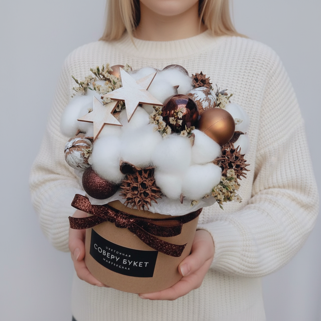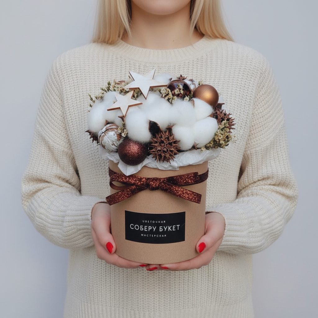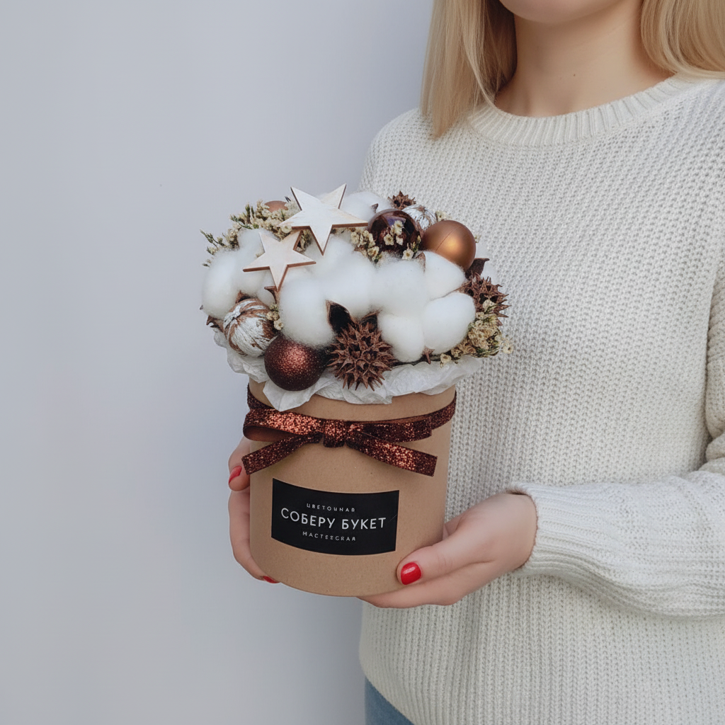 Новогодний презент из хлопка, сухоцветов, ёлочных украшений , в шляпной коробке!