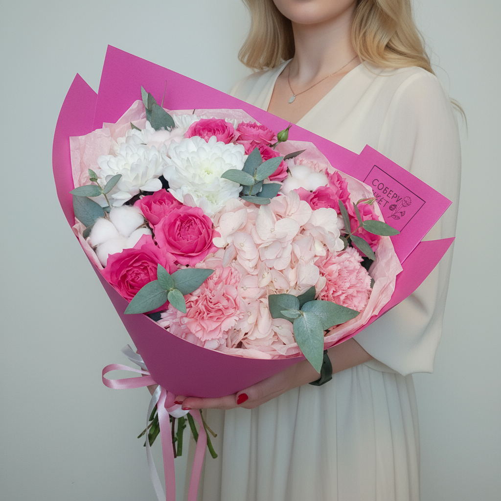 Этот сборный букет — настоящее произведение искусства, созданное природой! Розовая гортензия и малиновые розы гармонично сочетаются друг с другом, а добавление гвоздик и эвкалипта придает композиции завершенность и элегантность. Такой букет станет прекрасным подарком по любому поводу!