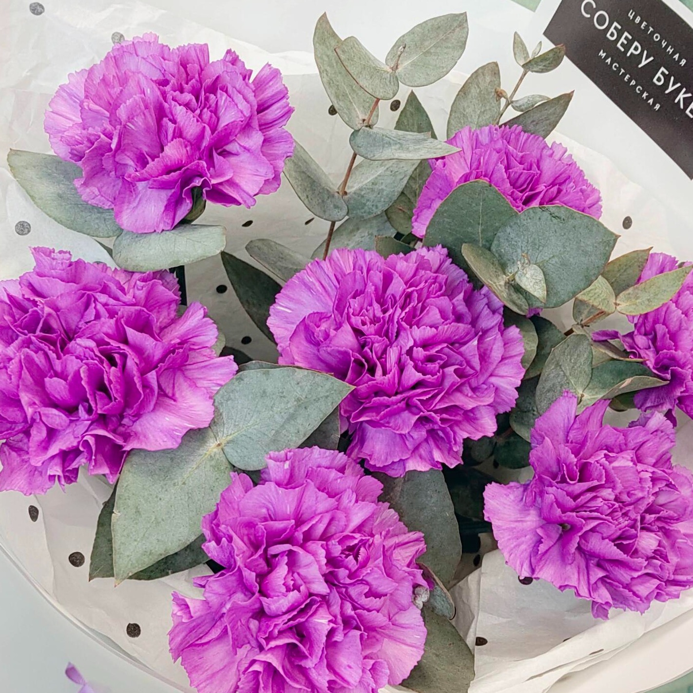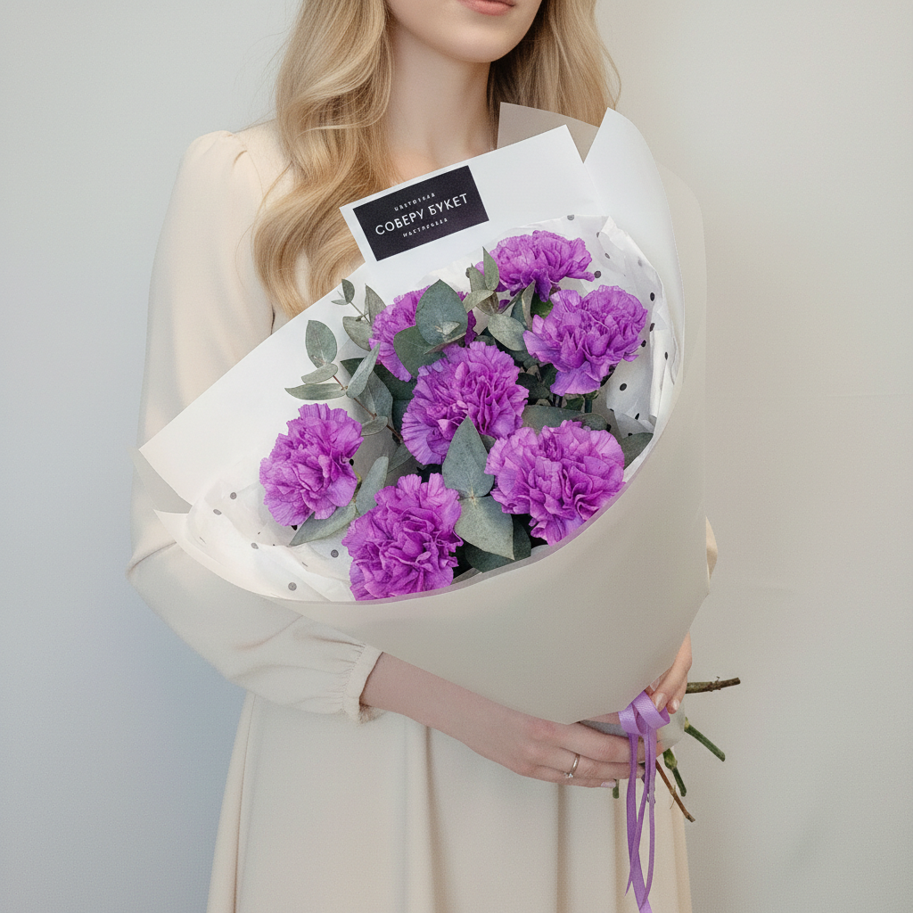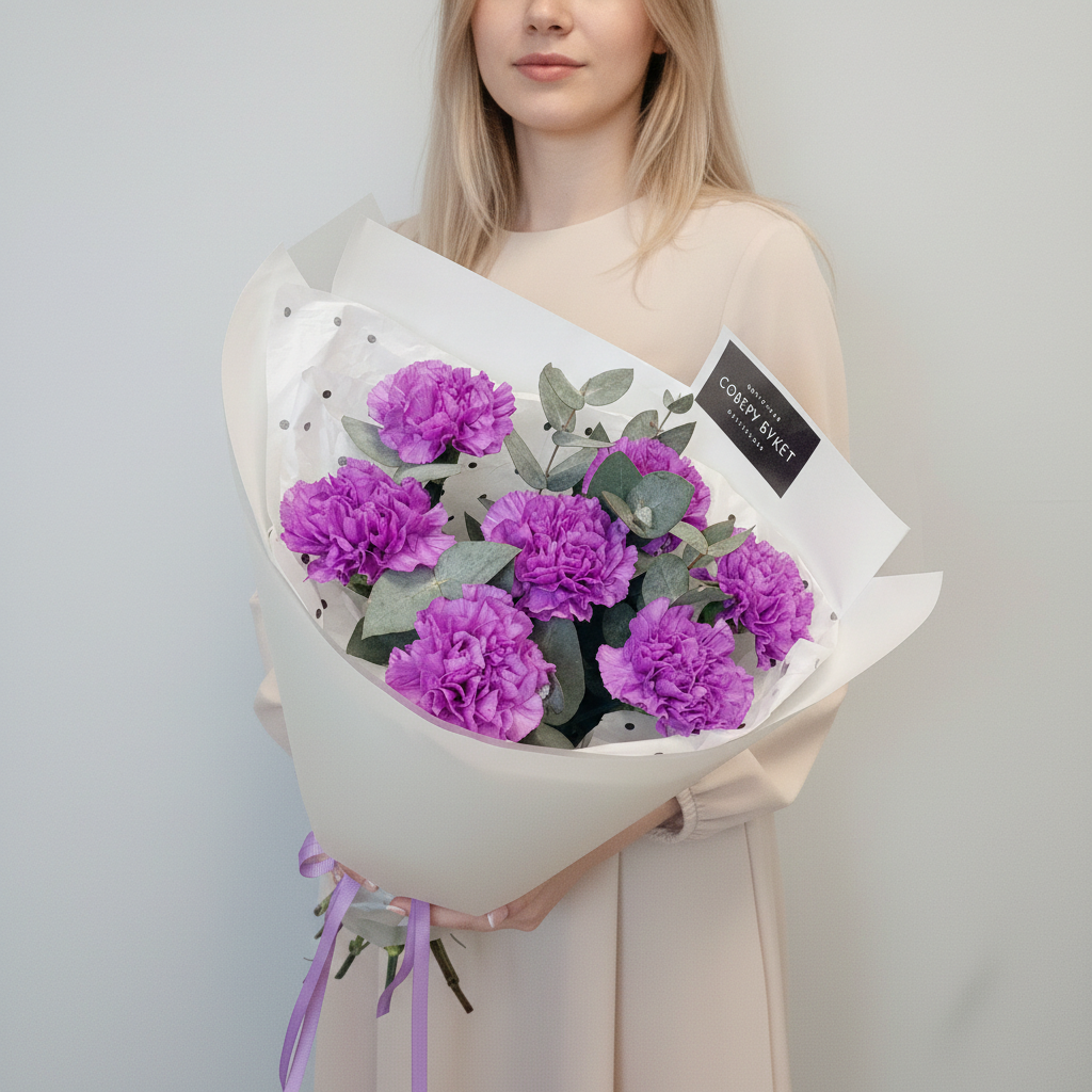 7 фиолетовых гвоздик с эвкалиптом – это монобукет, который будет радовать глаз своим насыщенным цветом и приятным ароматом. Композиция из свежих цветов создана нашим производителем "Соберу букет". Это идеальный выбор как для подарка близким людям, так и для декора интерьера вашего дома. Заказывайте прямо сейчас! 7 фиолетовых гвоздик с эвкалиптом