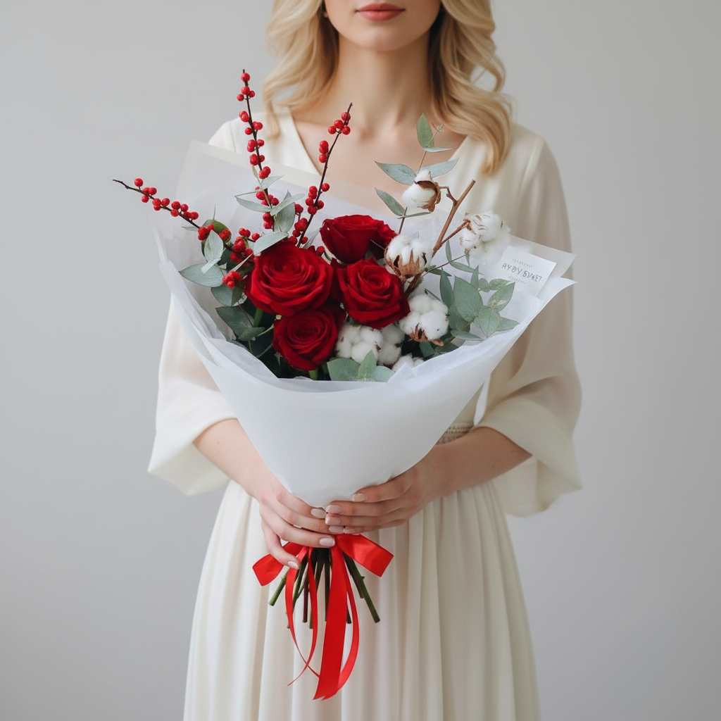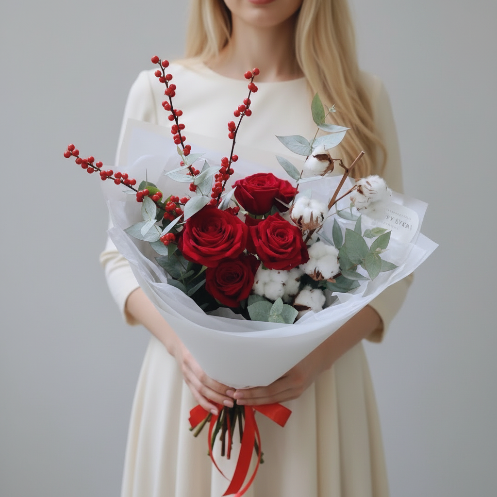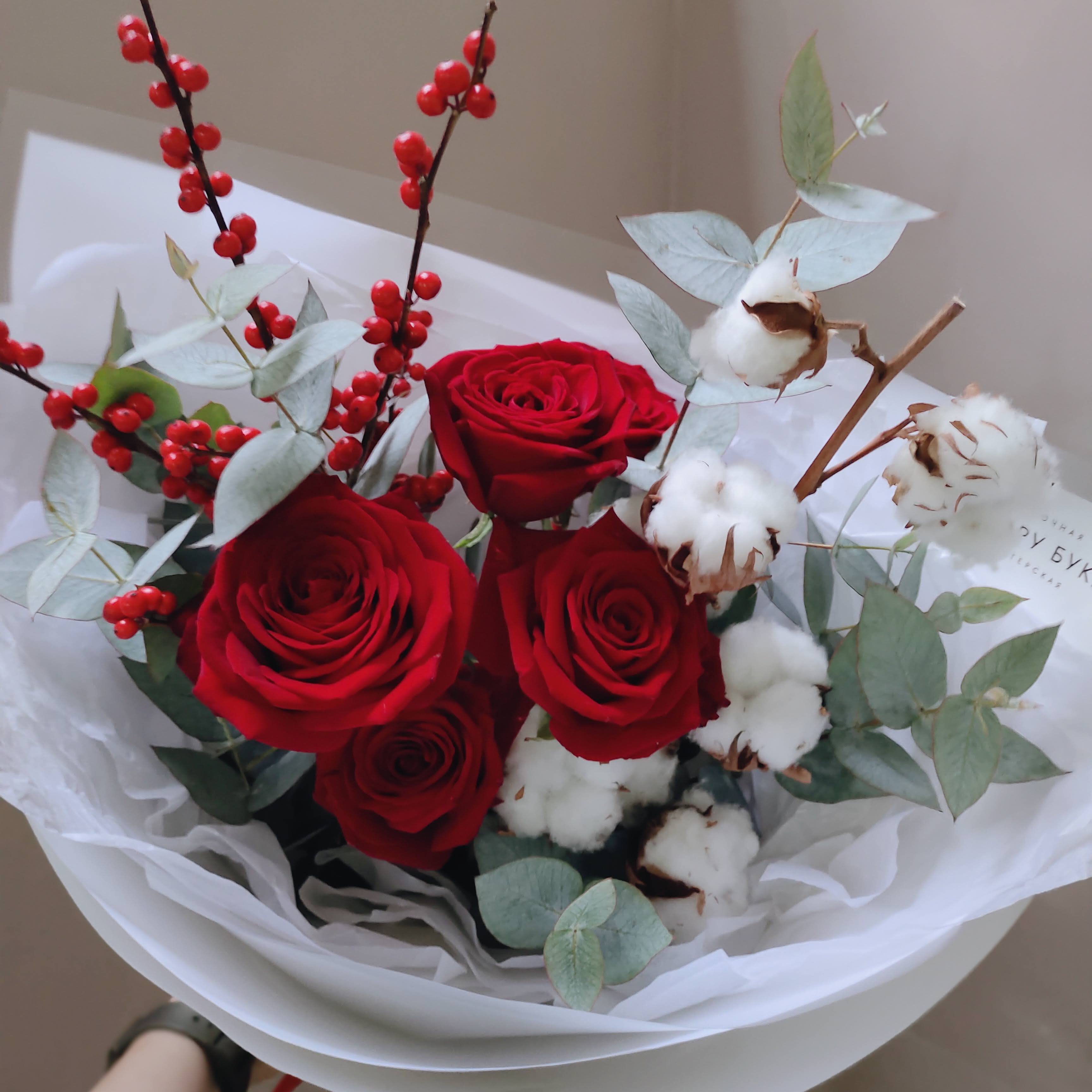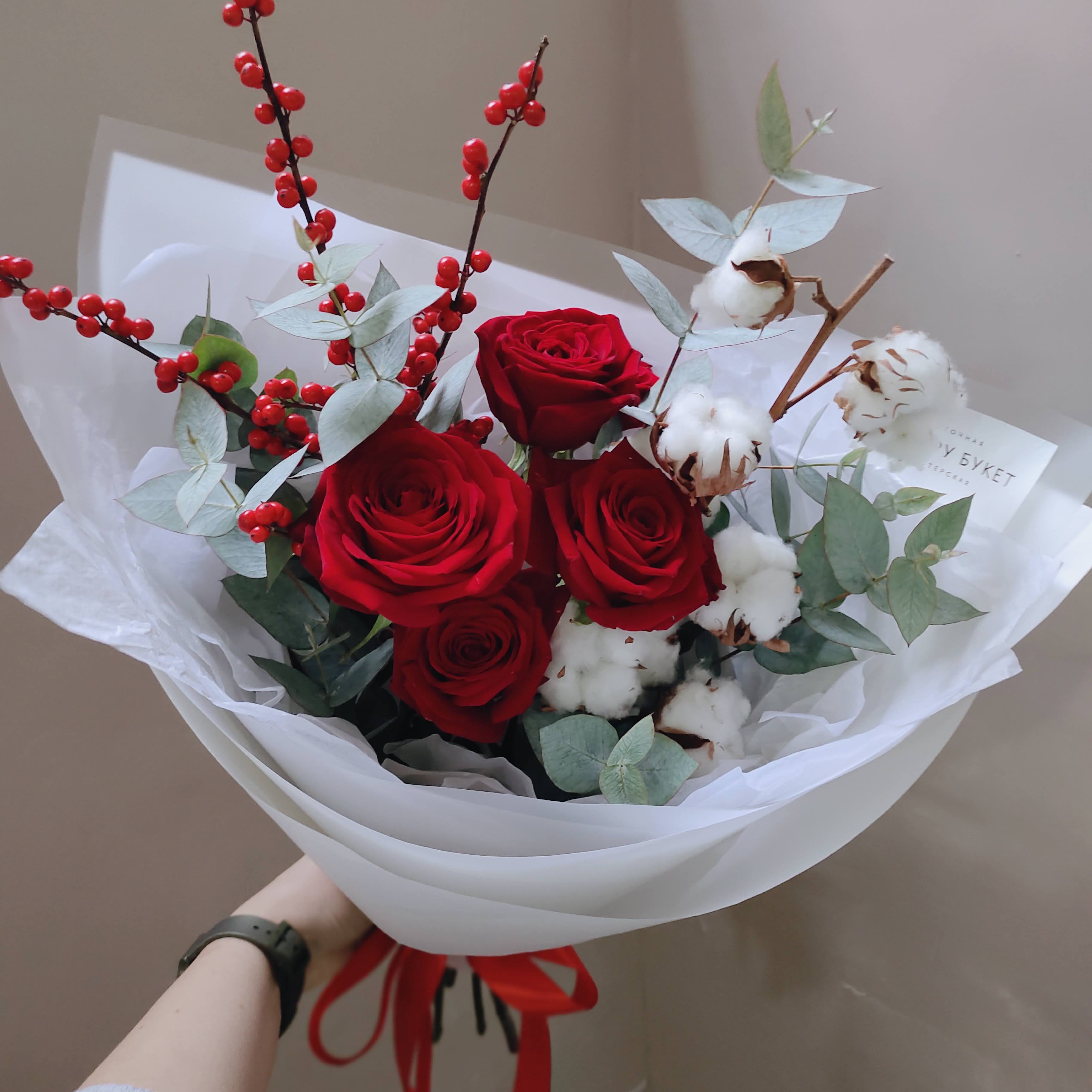 Почувствуйте страсть и глубину чувств вместе с роскошным букетом «Red Naomi»! Бархатные лепестки красных роз перекликаются со свежестью хлопка, а игривые нотки илекса и благородство эвкалипта создают уникальную симфонию любви и восхищения. Ваше послание будет услышано с этим великолепным букетом от нашего цветочного магазина!