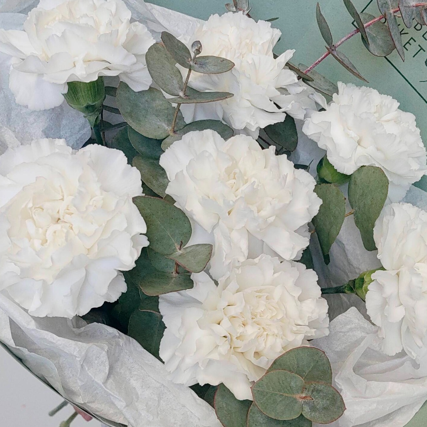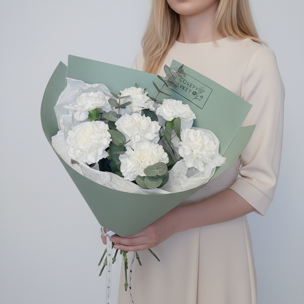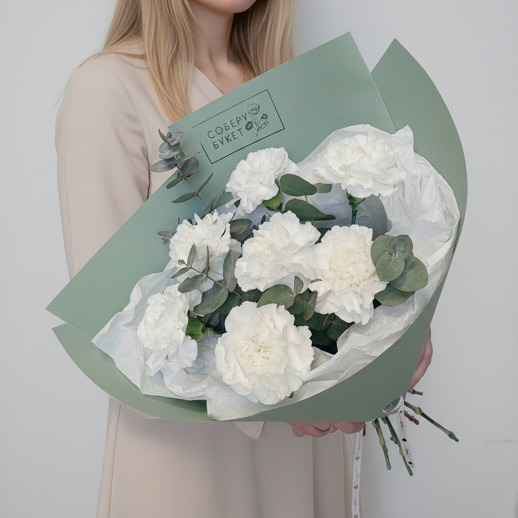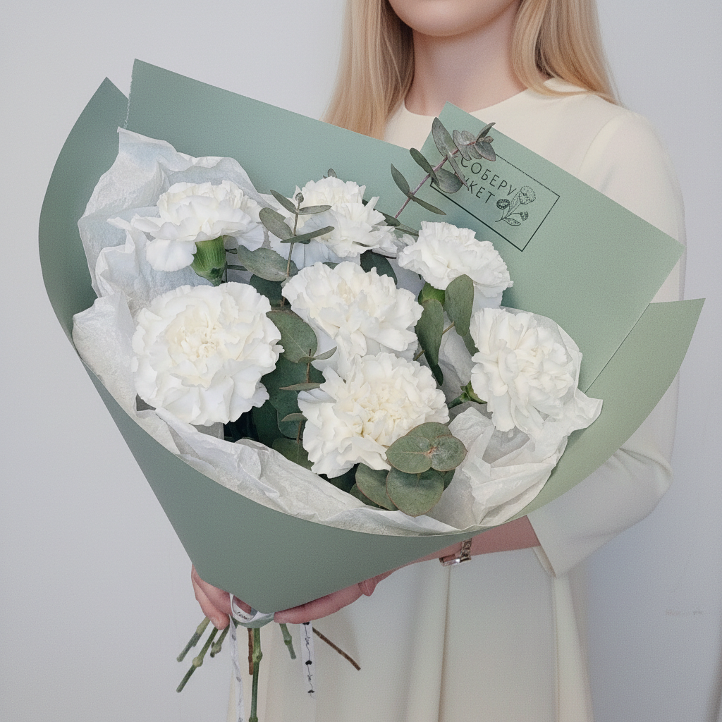 7 белых гвоздик с эвкалиптом в дизайнерской бумагеПрекрасный подарок для особенного человека! Белые гвоздики - это символ чистоты и непорочности, а элегантный эвкалипт добавляет букету нотку экзотики. Упаковка в дизайнерскую бумагу придает композиции завершенный вид. Такой букет станет отличным подарком к любому празднику или просто знаком внимания для любимого человека. Заказывайте сейчас и порадуйте своих близких прекрасным цветочным презентом!