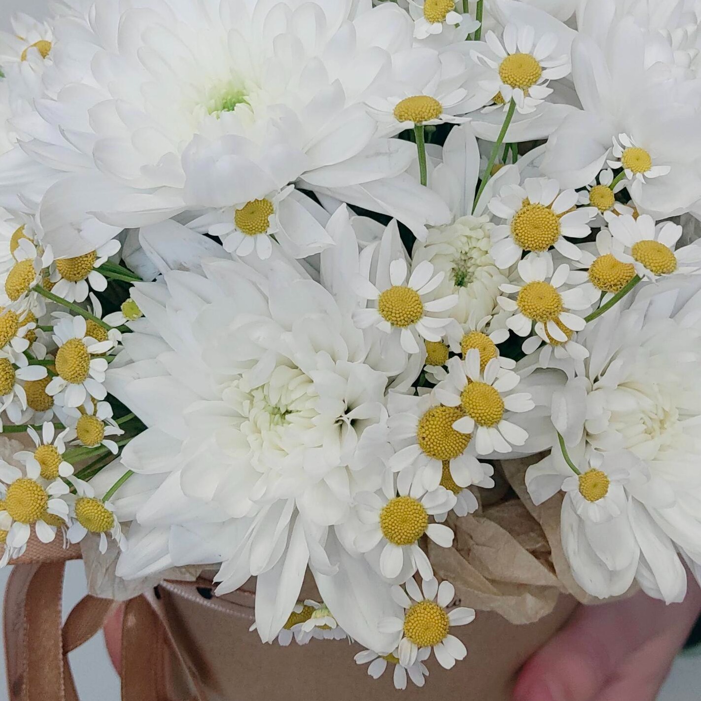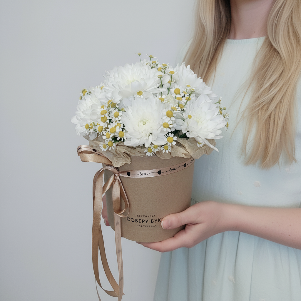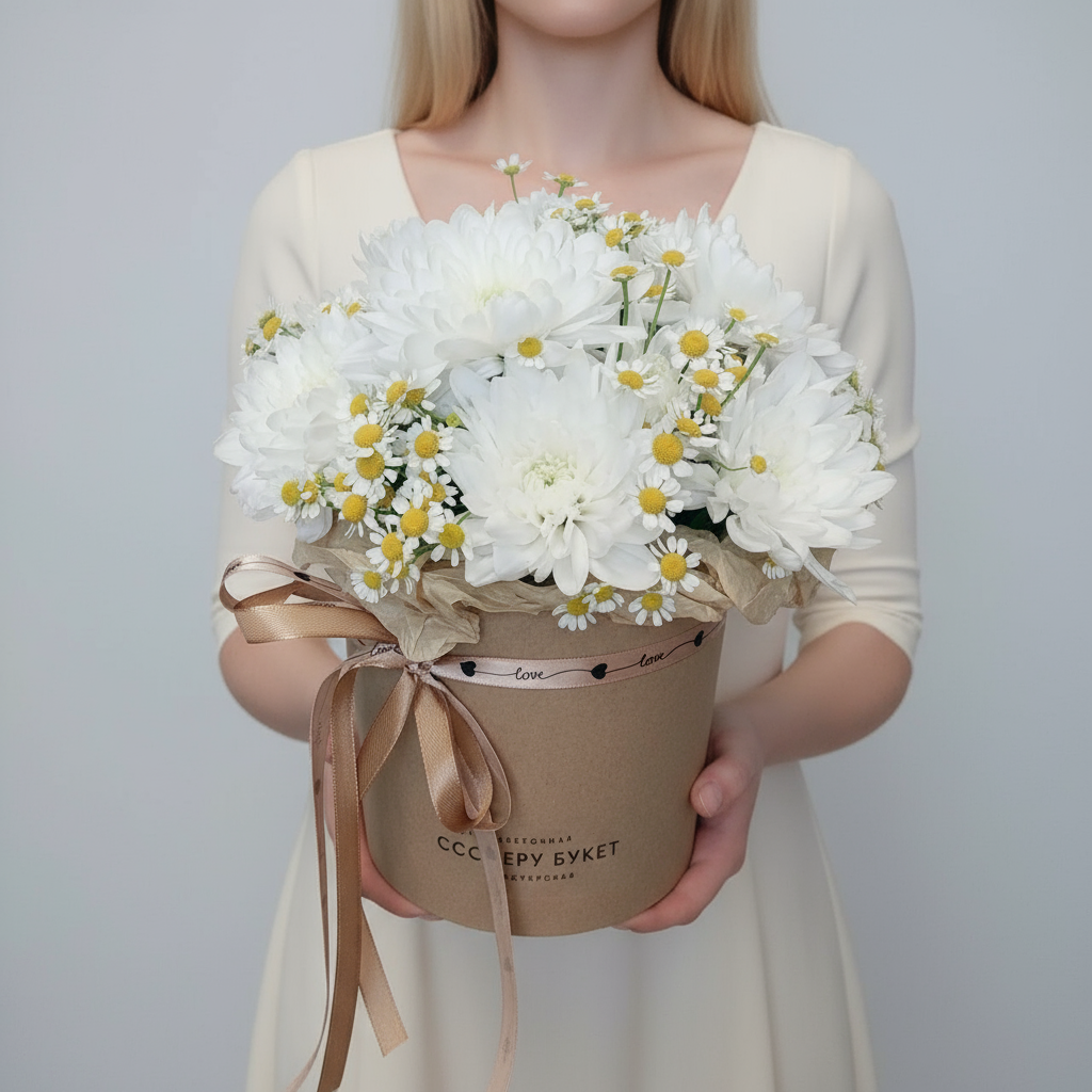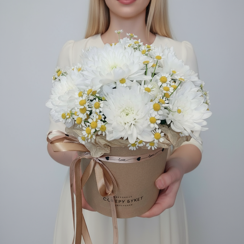 хризантема и полевые ромашки в коробке Почувствуйте себя героем романтической истории! Удивите любимую необычным букетом из хризантем и полевых ромашек. Нежная композиция, созданная нашими флористами специально для самых трепетных моментов жизни, подарит незабываемые эмоции. Хризантемы и полевые ромашки в стильной коробке можно заказать прямо сейчас по выгодной цене! Такой подарок точно оставит след в сердце вашей избранницы.