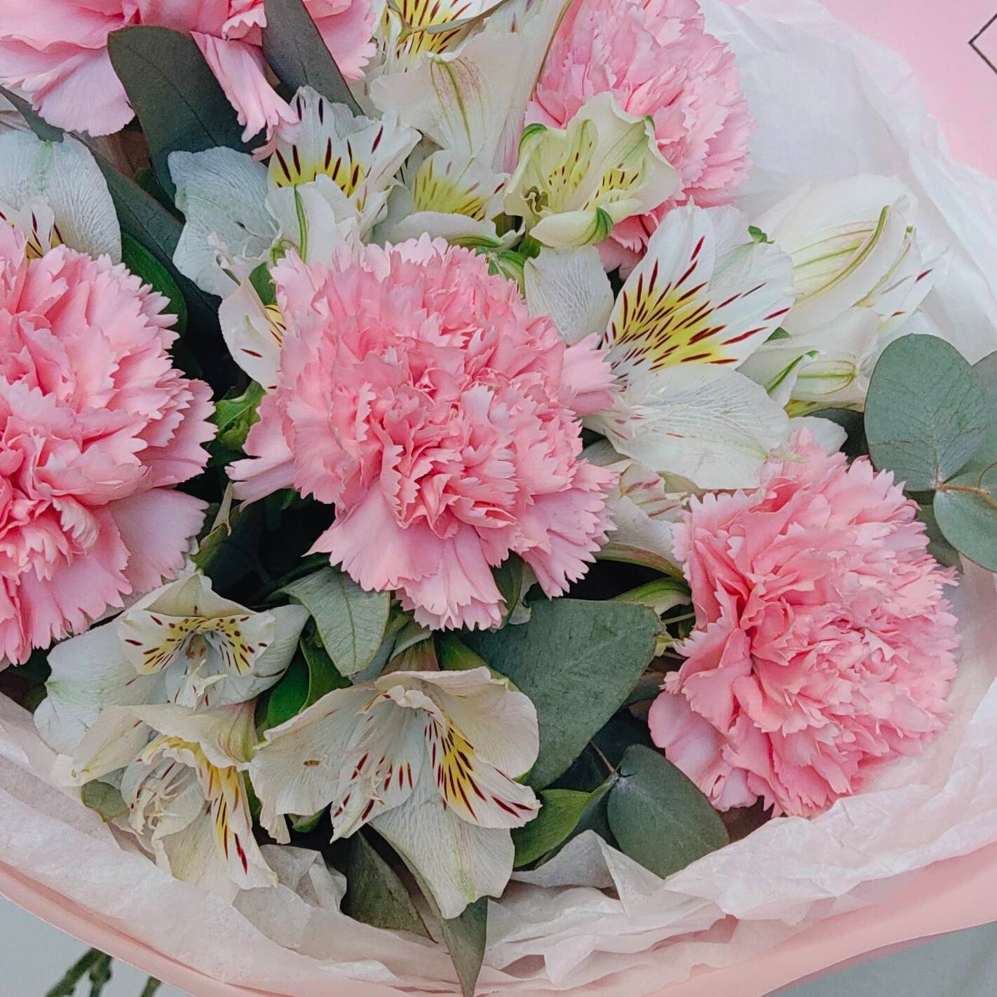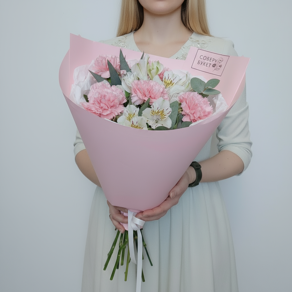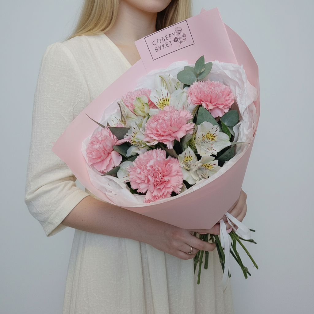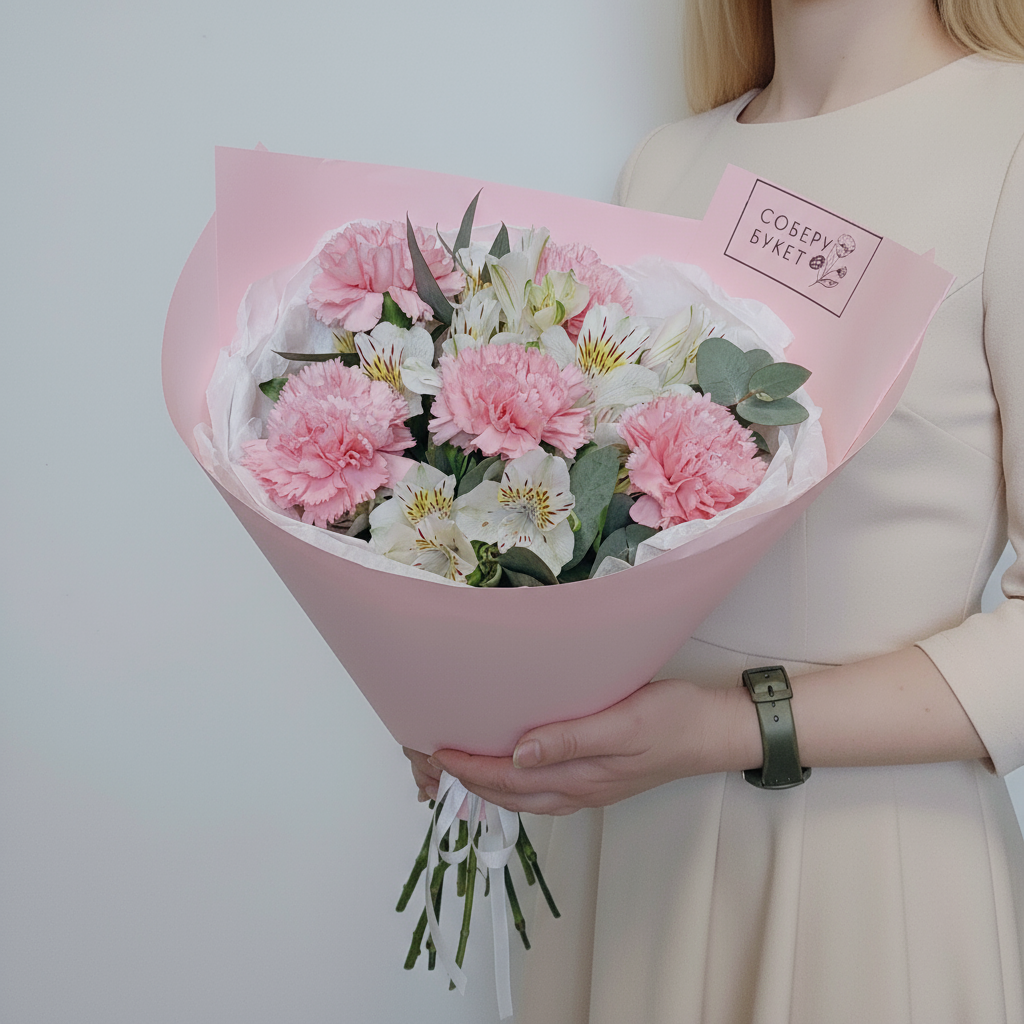 Представляем вашему вниманию великолепные розовые гвоздики, чарующие своей утонченностью альстромерии и ароматный эвкалипт – все это собрано воедино нашими талантливыми флористами для создания уникального букета, который станет идеальным подарком к любому празднику! Порадуйте своих близких этим прекрасным сочетанием свежих цветов, излучающих тепло и любовь. Ваш заказ будет доставлен прямо к порогу вашего дома, чтобы сохранить всю первозданную красоту каждого цветка. Не упустите возможность порадовать любимых роскошной цветочной композицией!