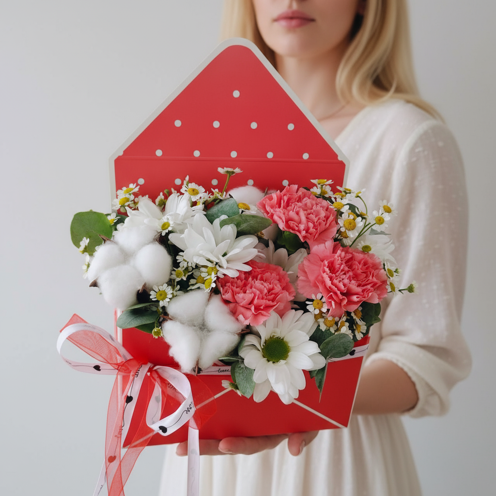 Почувствуйте всю нежность и трепетность этого букета! «Коробочка» с розовой гвоздикой и полевыми ромашками идеально сочетается со свежестью эвкалипта. А воздушные хлопковые коробки добавят нотки естественности и легкости. И как же без милых акцентов? Хризантемы кустовые белые ромашковые придают особую романтичность и трогательность. Порадуйте себя и своих близких этой ароматной композицией!