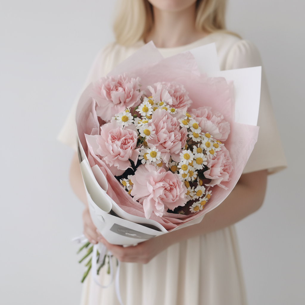 Хотите сделать приятное близким? Подарите букет свежих цветов! В нашем магазине вас ждёт огромный выбор флористических композиций. Обратите внимание на этот милый букетик из семи розовых гвоздик и полевой ромашки. Он так трогателен своей простотой и непосредственностью! Ваши близкие непременно оценят такой жест внимания. Ведь он создан специально для того, чтобы дарить радость и хорошее настроение!