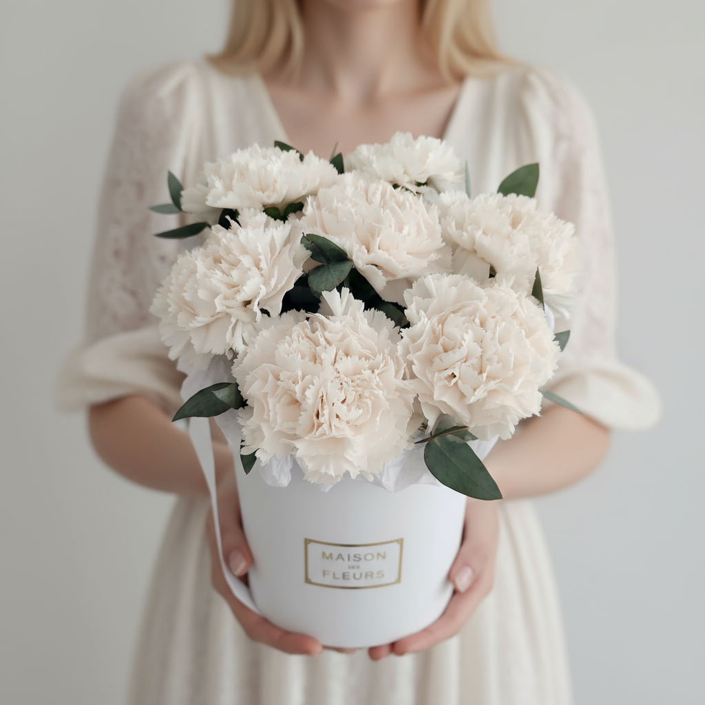 Почувствуйте атмосферу праздника! 7 кремовых гвоздик, дополненных свежестью эвкалипта, аккуратно уложены в стильную подарочную коробочку. Это идеальный подарок для тех, кто ценит элегантность и естественную красоту. Наши цветы сохранят свой первозданный вид до двух недель, напоминая о вас каждый день. Дарите радость вместе с нами!