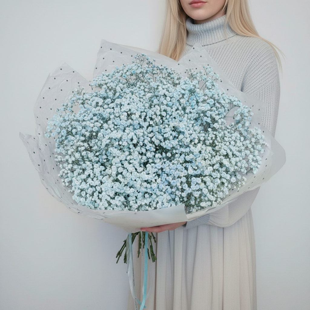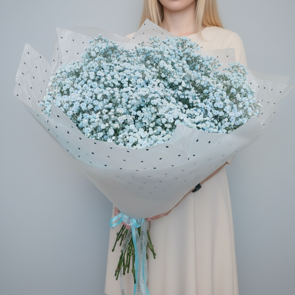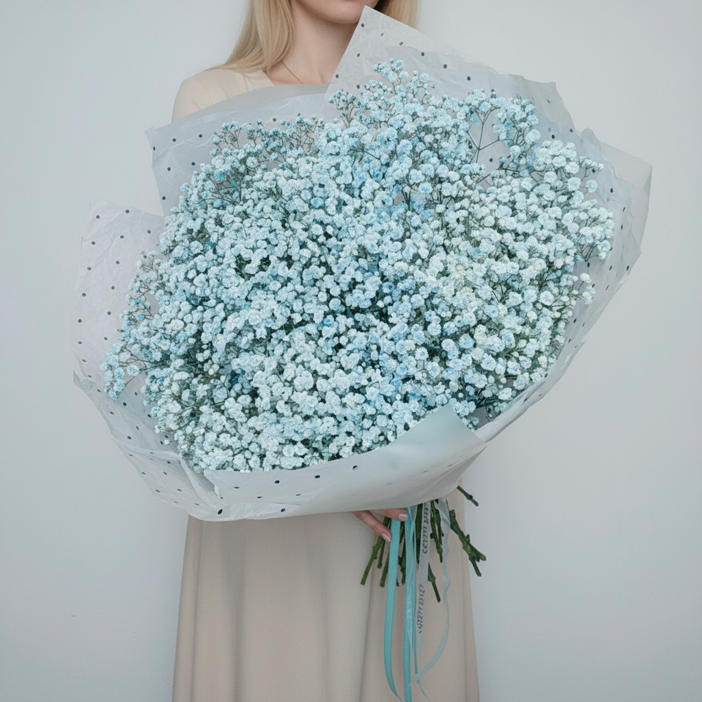 Букет из 19 веток голубой гипсофилы – это воплощение свежести и элегантности. Идеальный подарок для любого случая! Создайте атмосферу праздника вместе с нами!