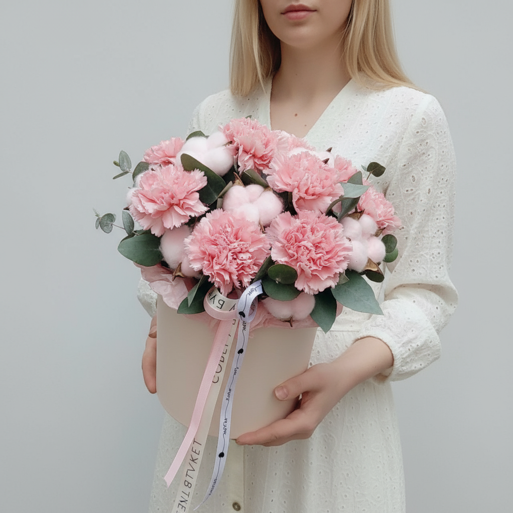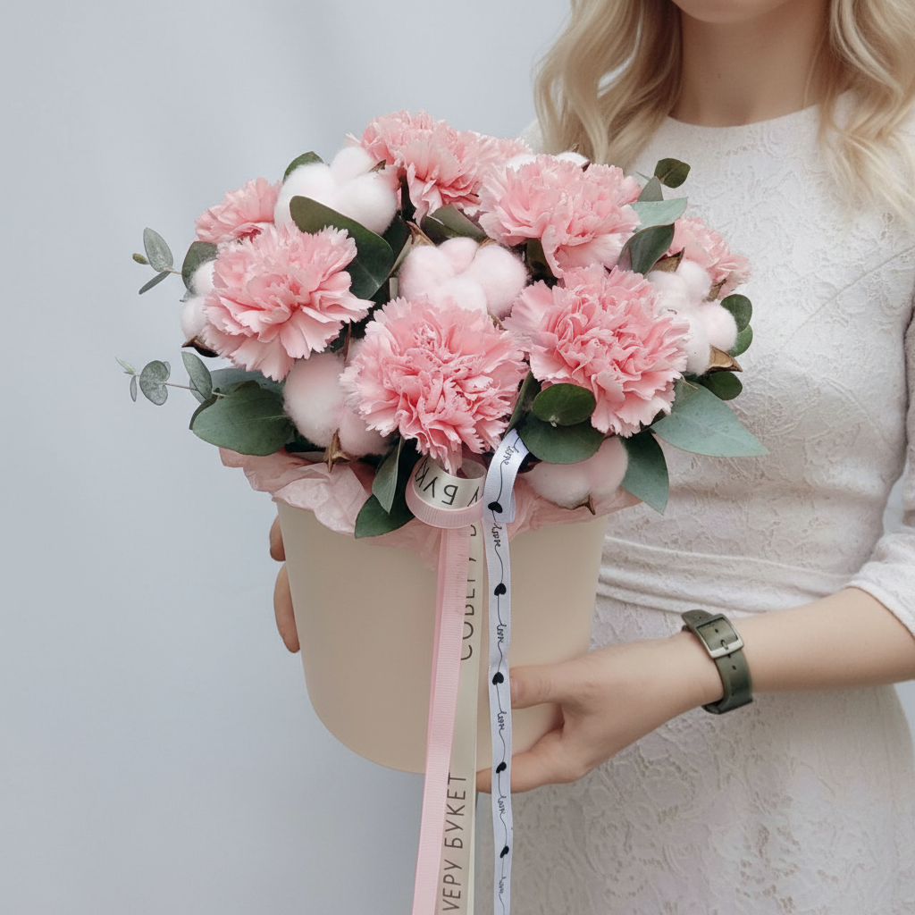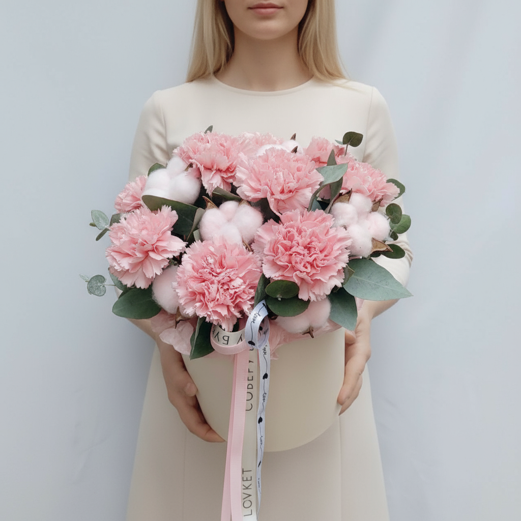 Роскошные розовые гвоздики с деликатным ароматом хлопка и свежестью эвкалипта собраны в элегантной шляпной коробке – идеальный подарок для любого случая! Заказывайте прямо сейчас и создавайте незабываемые моменты вместе с нами!