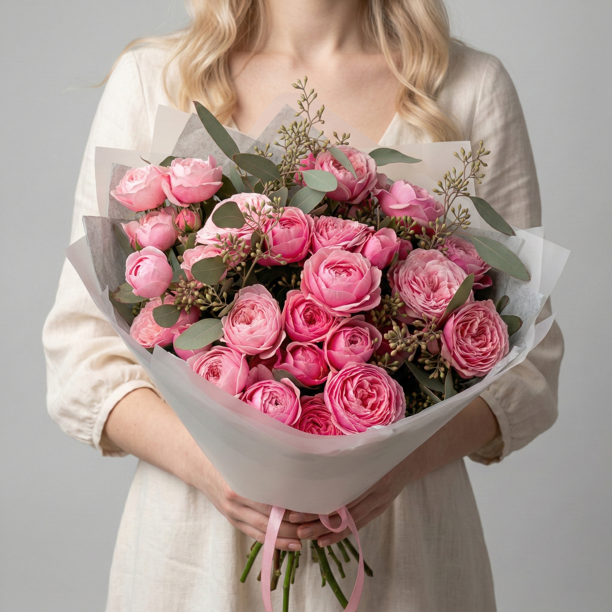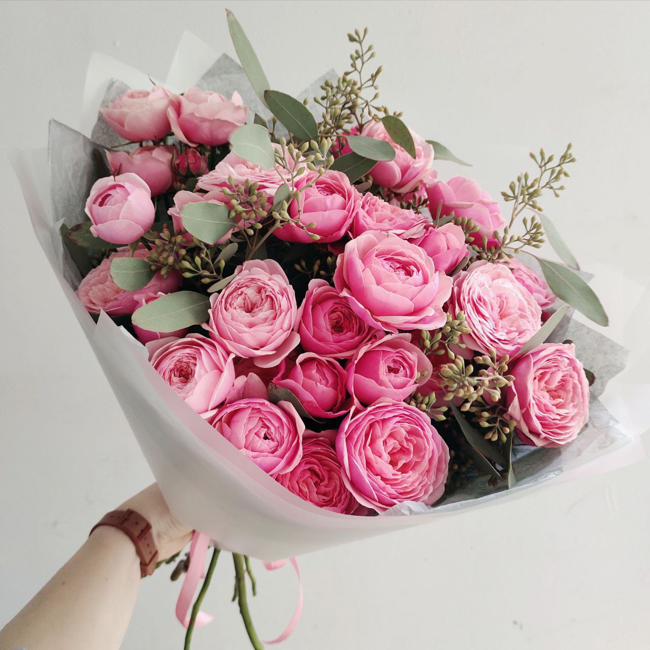 Букет из кустовых пионовидных малиновых роз