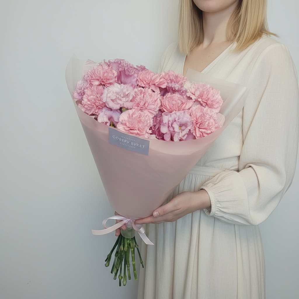 Почувствуйте прикосновение весны вместе с букетом из свежих розовых гвоздик и нежных эустом! Этот восхитительный подарок станет идеальным выражением ваших чувств к любимым и близким людям. Шелковистые лепестки цветов наполнят дом атмосферой тепла и уюта, а их тонкий аромат подарит незабываемые моменты радости. Не ждите особого случая – дарите радость прямо сейчас с нашим эксклюзивным букетом из розовых гвоздик и эустомы!