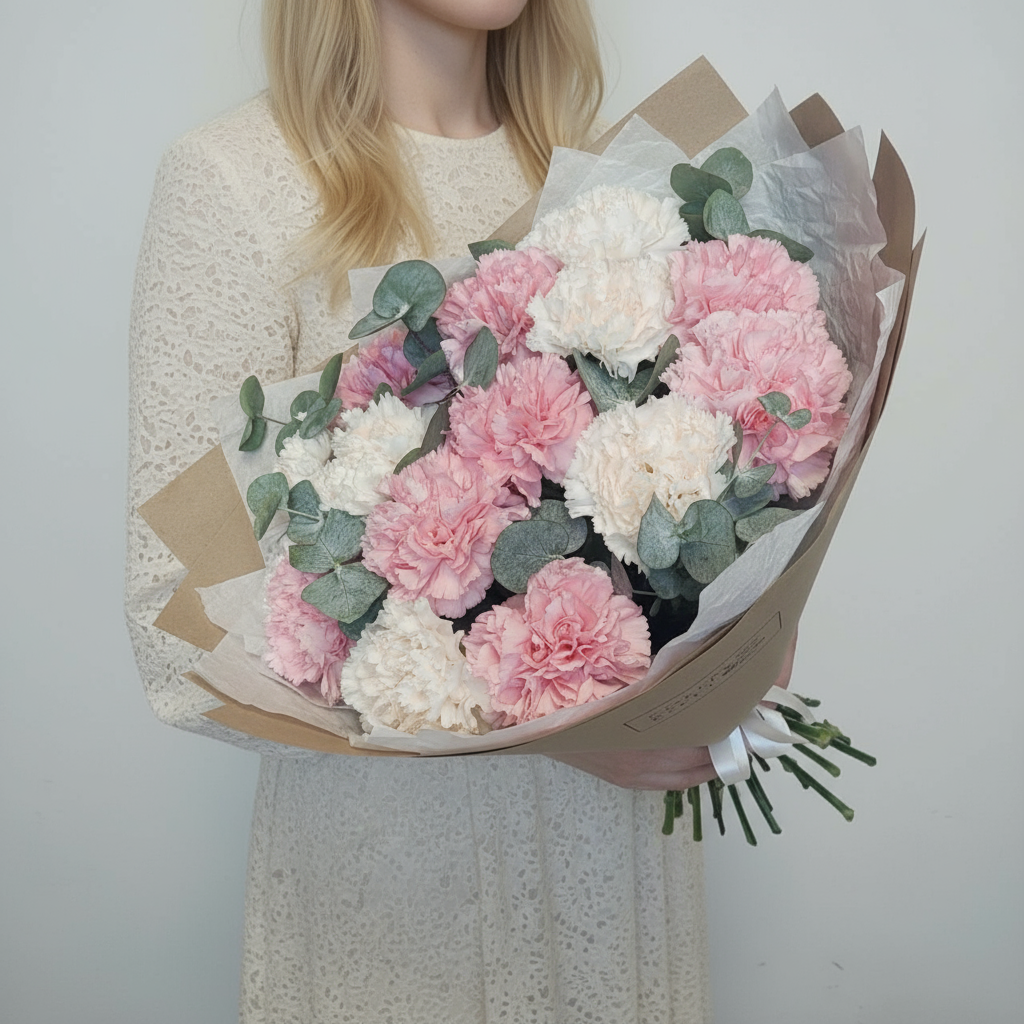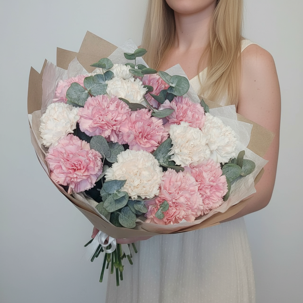 Представляем вашему вниманию уникальный букет «Кремовые и розовые гвоздики с эвкалиптом»! Это невероятное сочетание элегантности и экзотики для самых утончённых ценителей прекрасного. Составленный из 15 свежих цветов, этот букет обладает потрясающим ароматом благодаря добавлению листьев эвкалипта. Нежные оттенки розового, белого и кремового создают гармоничную палитру, которая подчеркнёт любой интерьер. Будь то подарок к празднику или знак внимания коллеге по работе – « гвоздики с эвкалиптом» всегда будут актуальны. Закажите сейчас и наслаждайтесь красотой этого уникального произведения искусства от наших флористов!