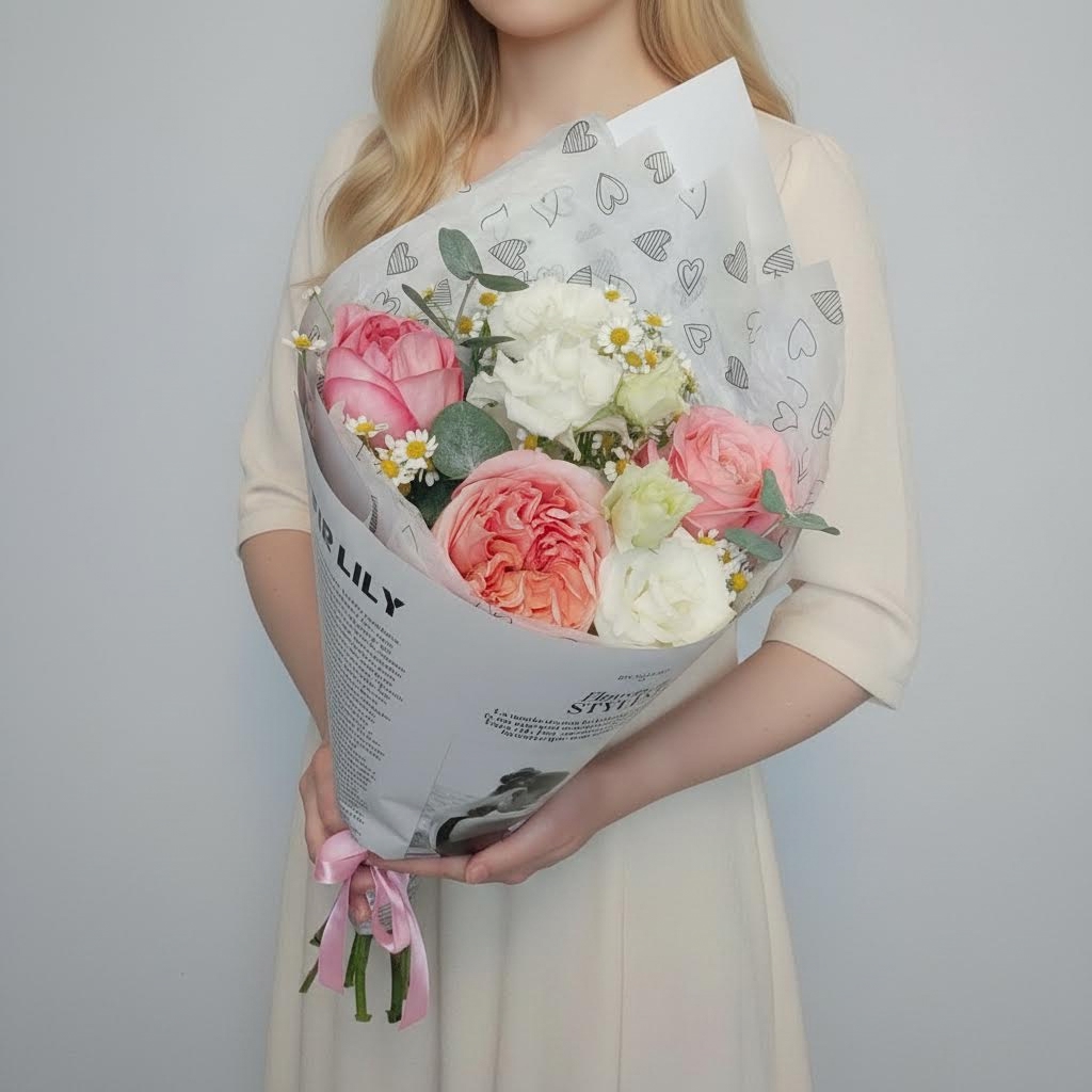 Этот прекрасный букет сочетает в себе белоснежную эустому, солнечную матрикарию и пышные пионовидные розы, создавая гармоничную композицию. Белоснежные и розовые оттенки подчеркивают свежесть и элегантность цветов, превращая этот букет в идеальный подарок для любого торжества. Великолепное решение как для романтического свидания, так и для поздравления близких с праздником. Завернутый в стильную упаковку, он станет украшением вашего дома или офиса.