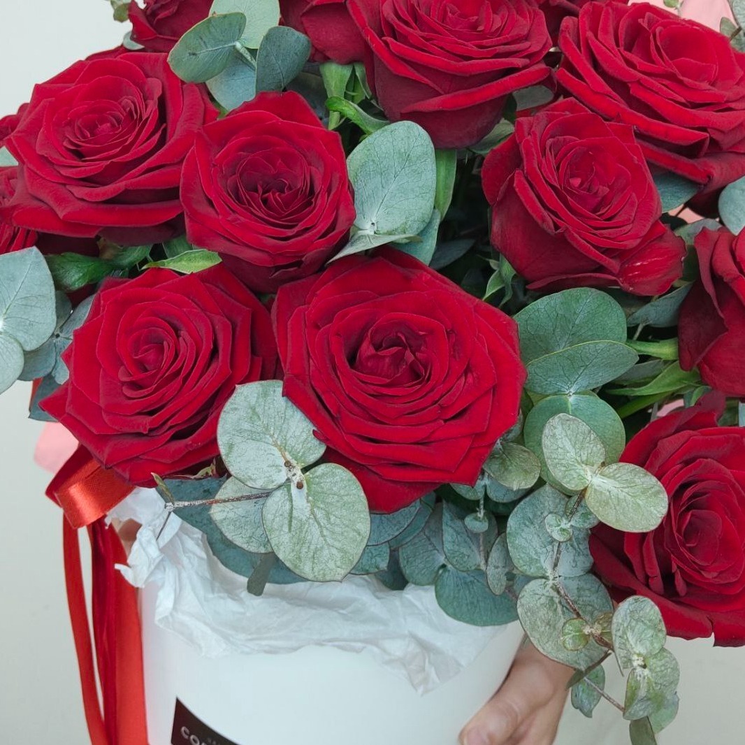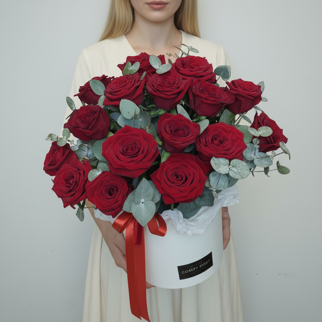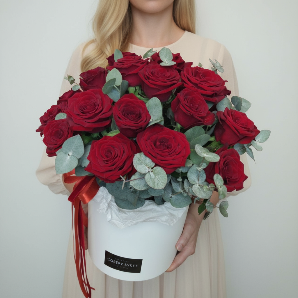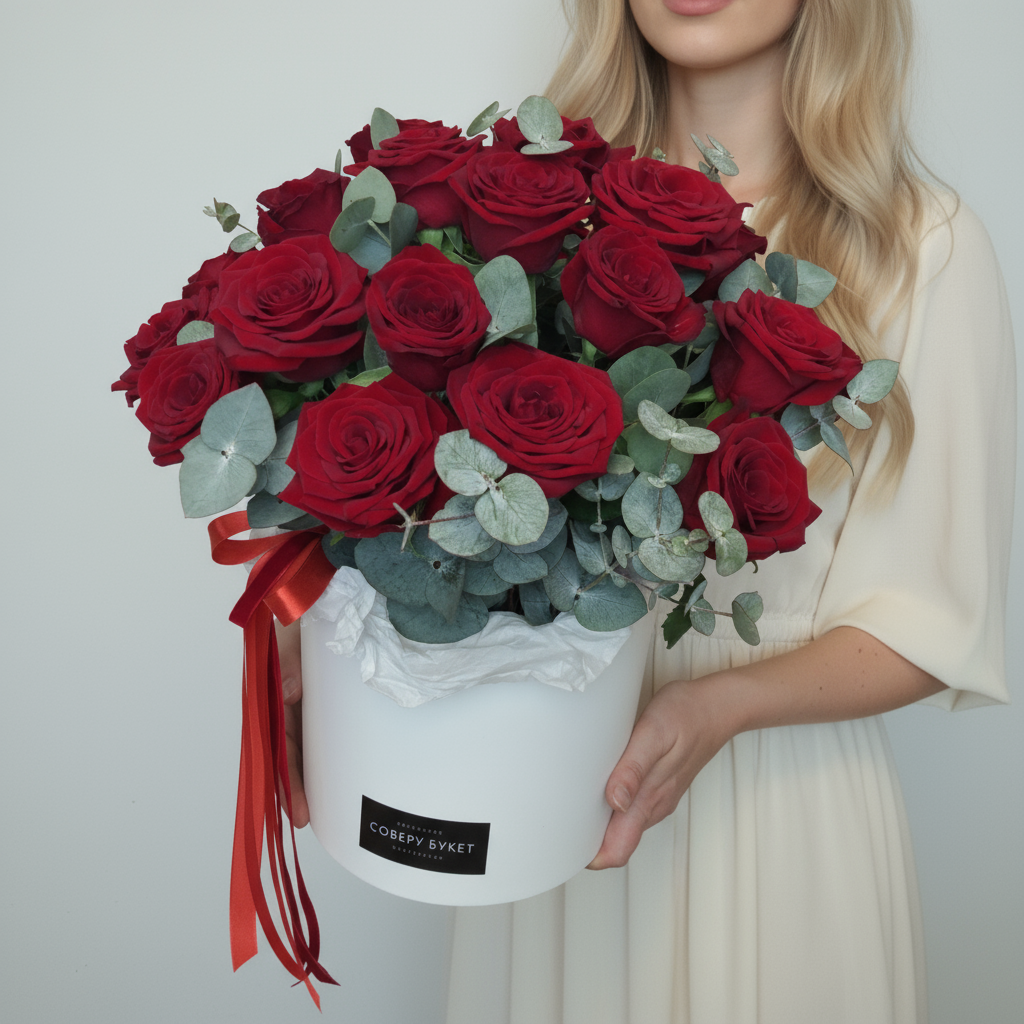 Почувствуйте любовь каждой клеточкой! Изысканные 25 красных роз в обрамлении свежего эвкалипта теперь доступны в стильной шляпной коробке. Этот элегантный подарок станет идеальным выражением ваших чувств и наполнит день адресата ароматами лета и теплом вашего сердца. Закажите сейчас и подарите радость!