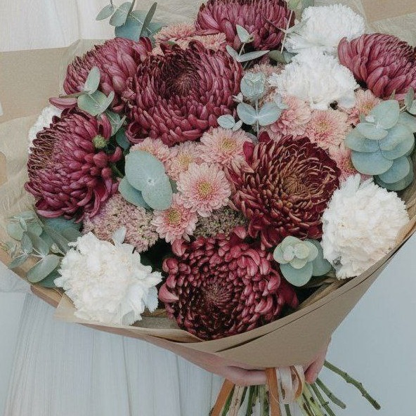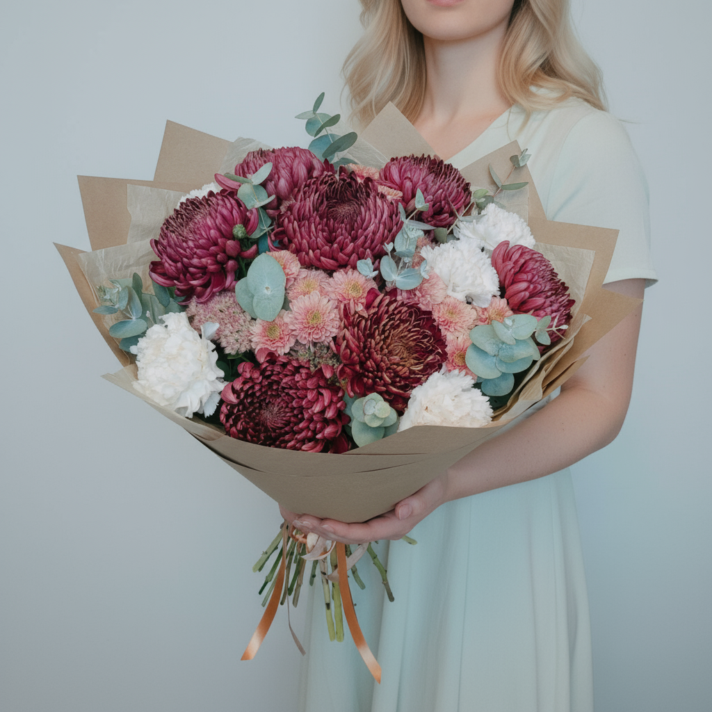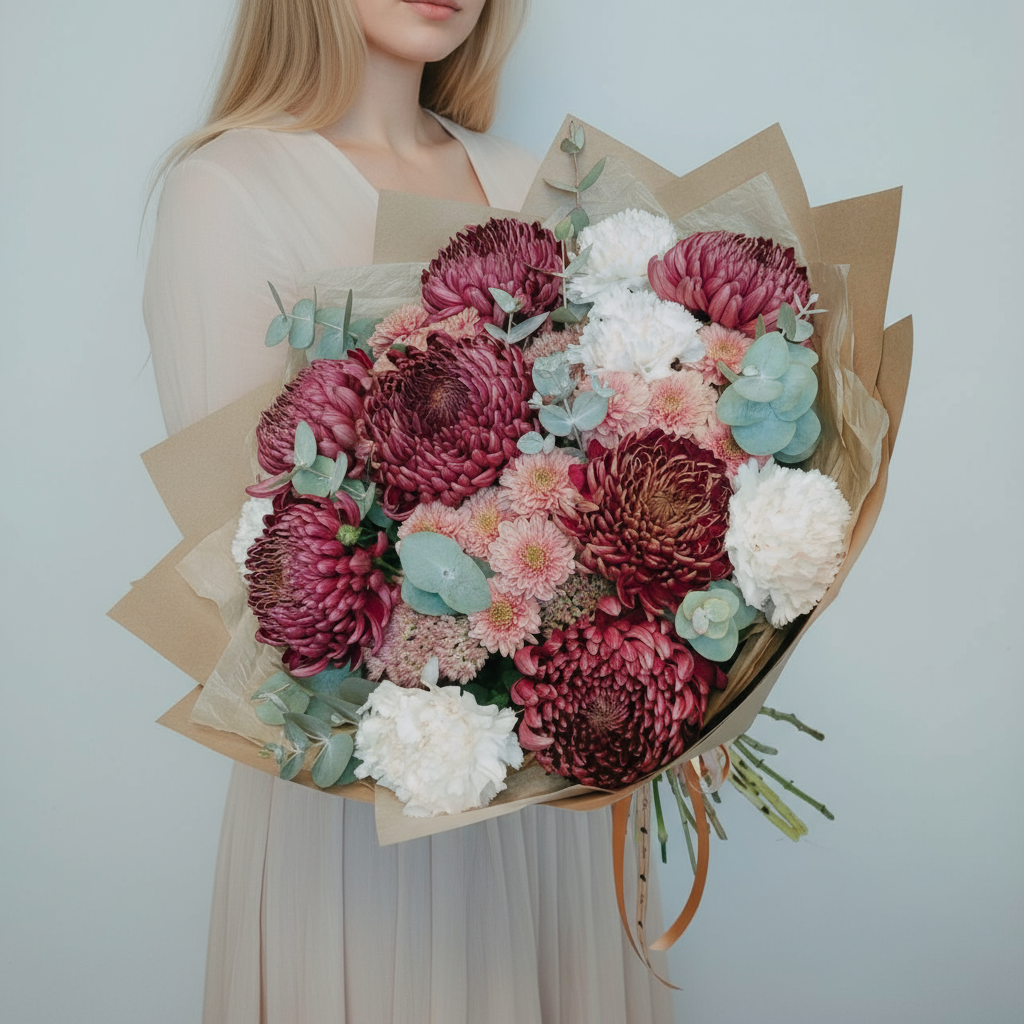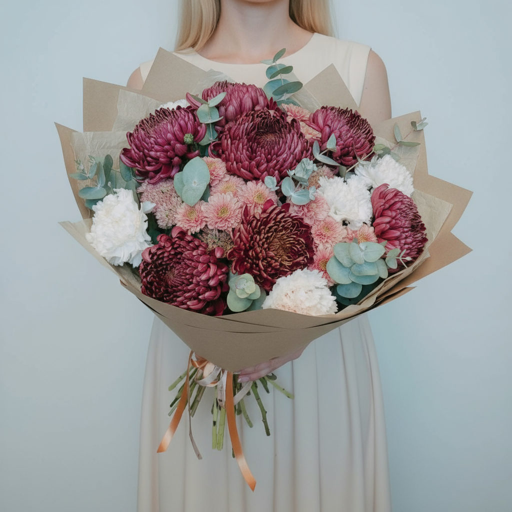 Осенний букет из хризантем, гвоздик и эвкалипта