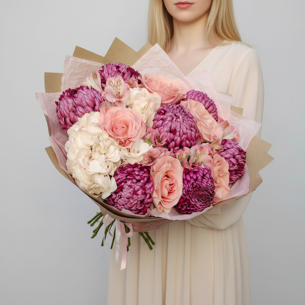 Нежные оттенки розовых роз, элегантность изящных хризантем и утонченность пышной гортензии сплетаются в этом авторском букете, создавая гармоничное сочетание ароматов и форм. Идеальный подарок для тех, кто ценит красоту природы и внимание к деталям.