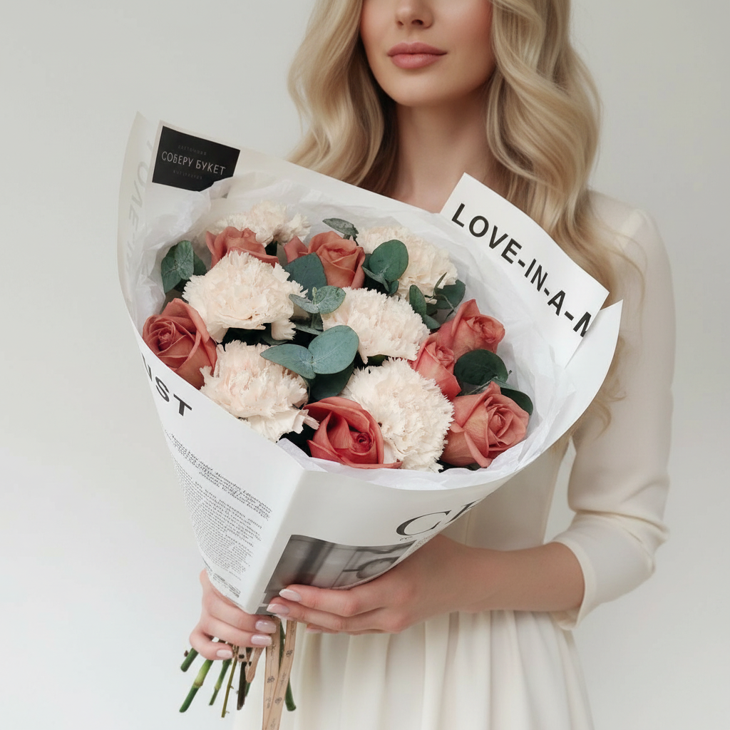 Погрузитесь в ароматную нежность букета из роскошных роз глубокого кофейно-шоколадного оттенка и кремовых гвоздик, дополненных благородным ароматом эвкалипта. Это воплощение элегантности и изысканности станет прекрасным сюрпризом любимой женщине, подчеркнёт глубину ваших чувств и добавит волшебства в её день.