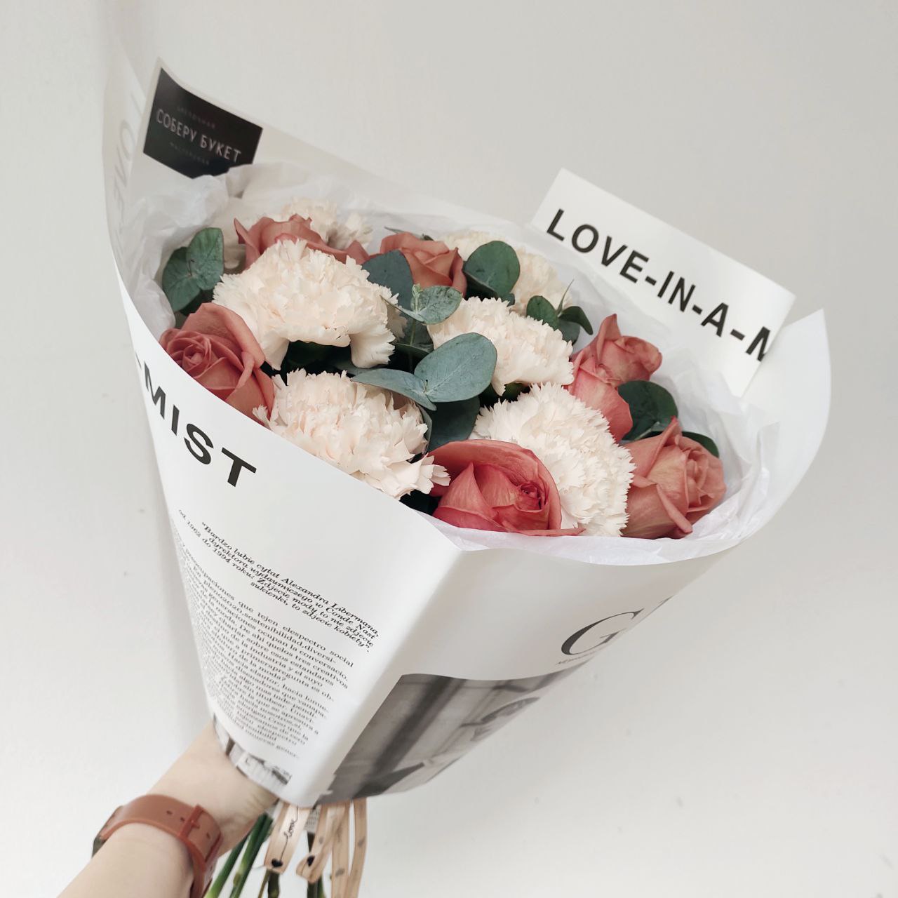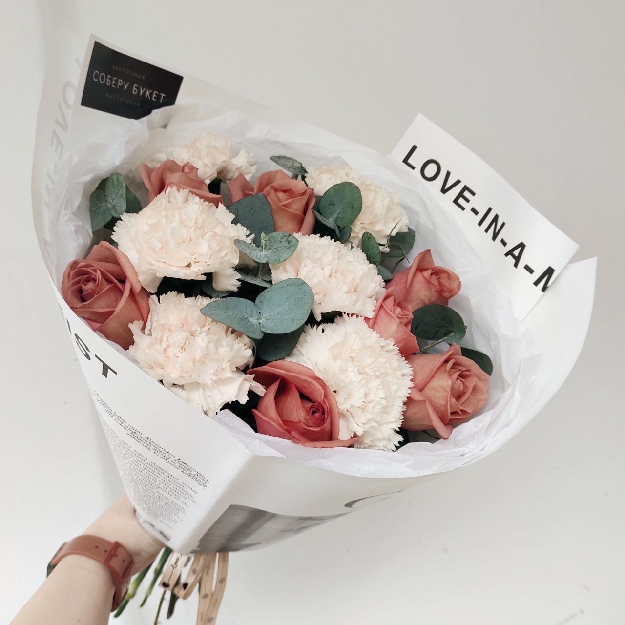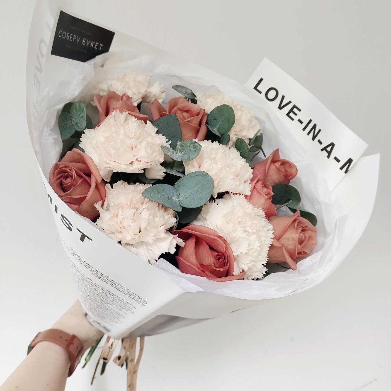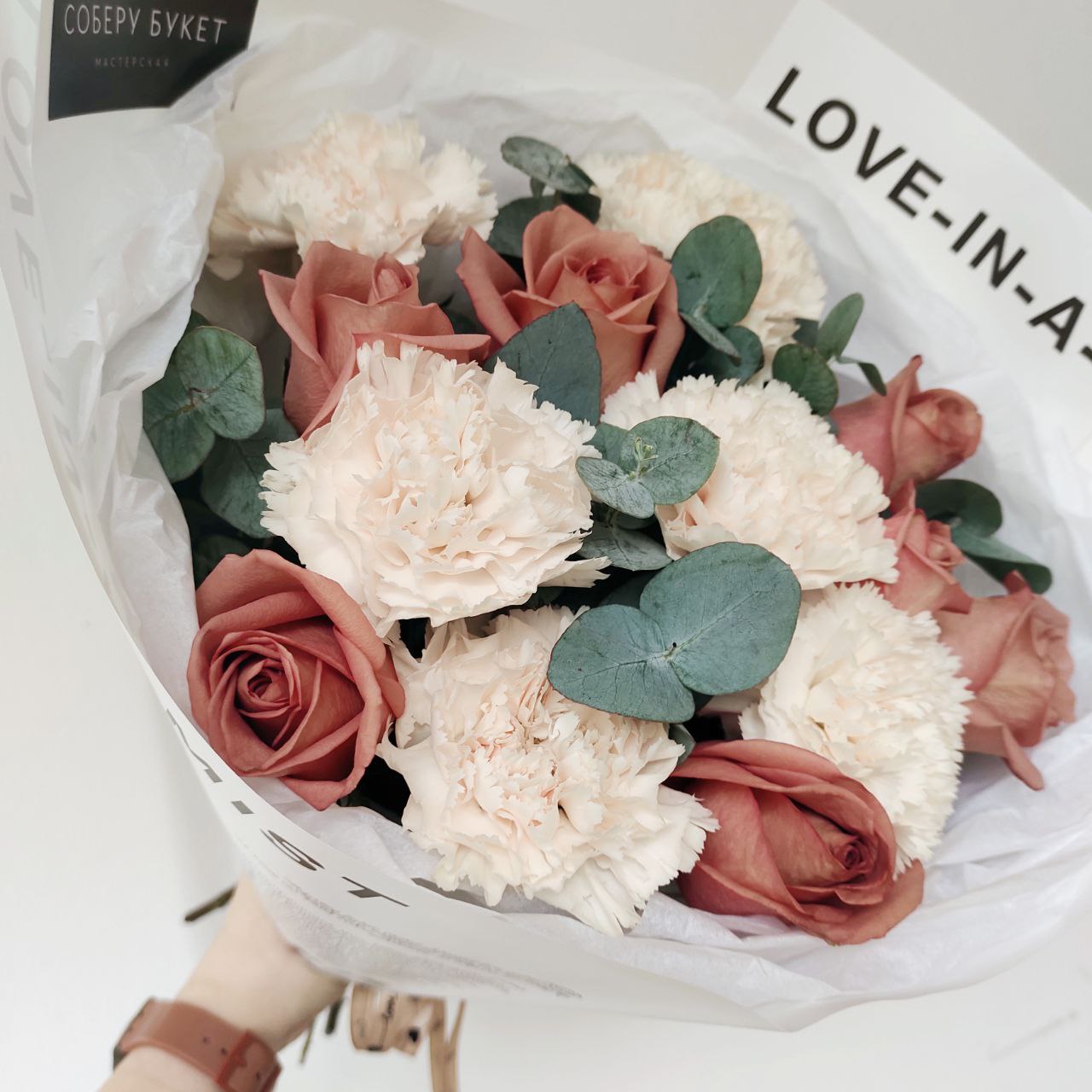 Букет из роз кофейного цвета, кремовых гвоздик и эвкалипта