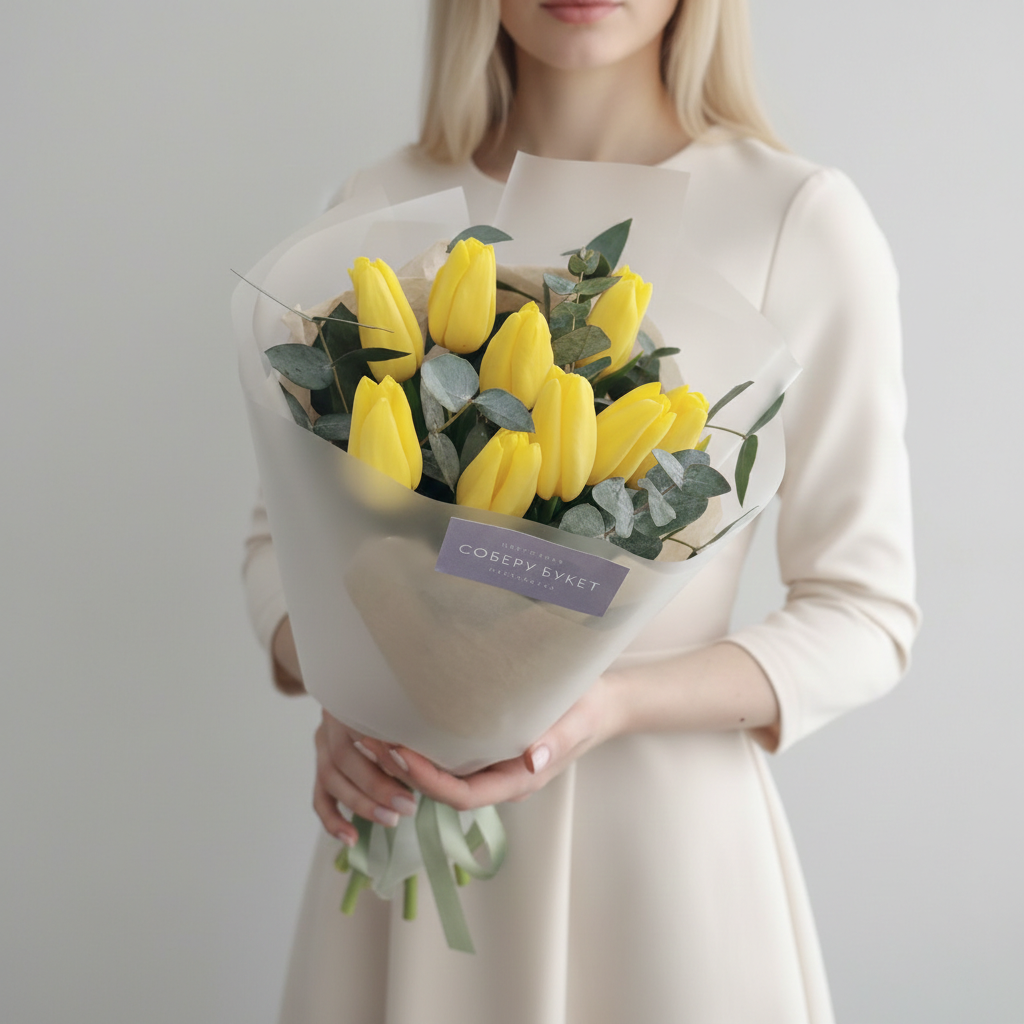 Яркий букет из девяти жёлтых тюльпанов – символ начала весны и искренних чувств! Элегантные линии бутонов подчеркнуты нежными оттенками зелени эвкалипта, который добавляет композиции свежести и утонченности.