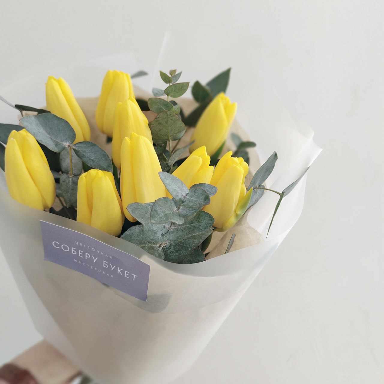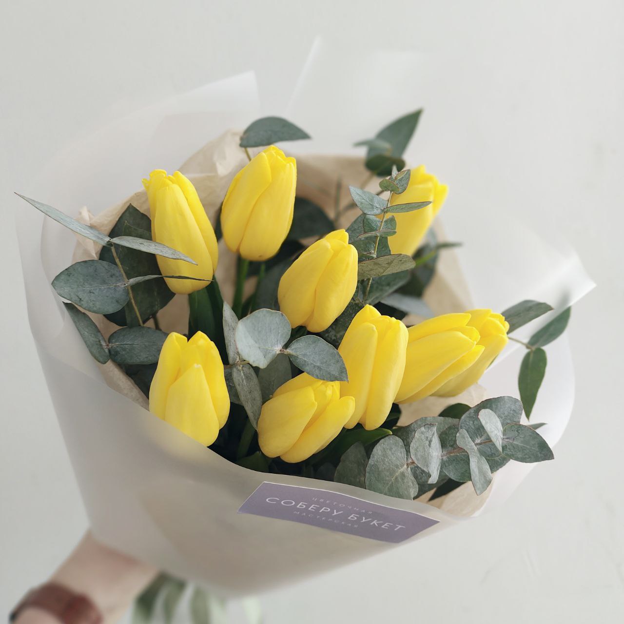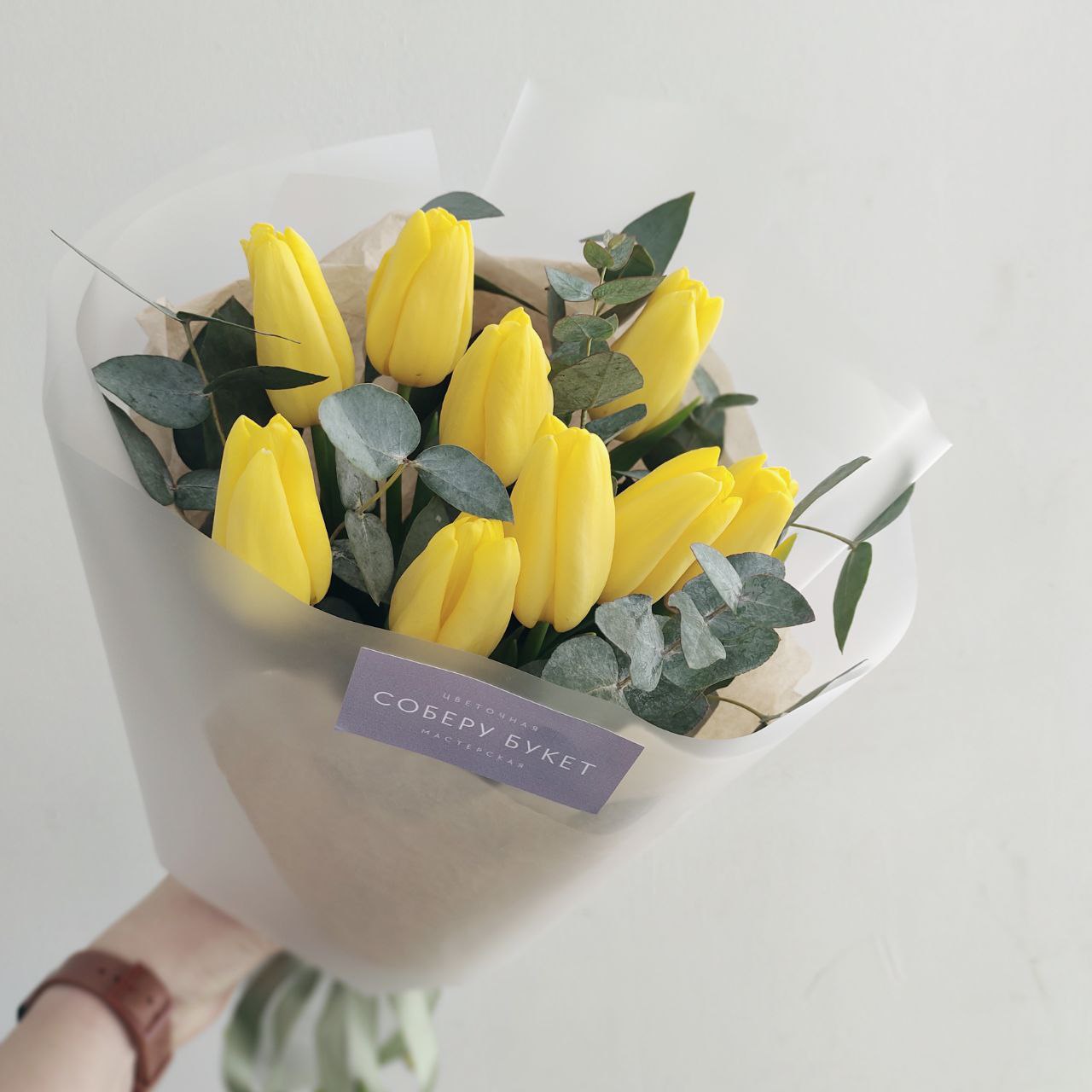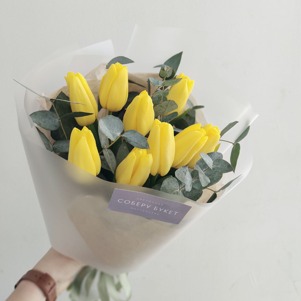 Букет из 9 жёлтых тюльпанов с эвкалиптом