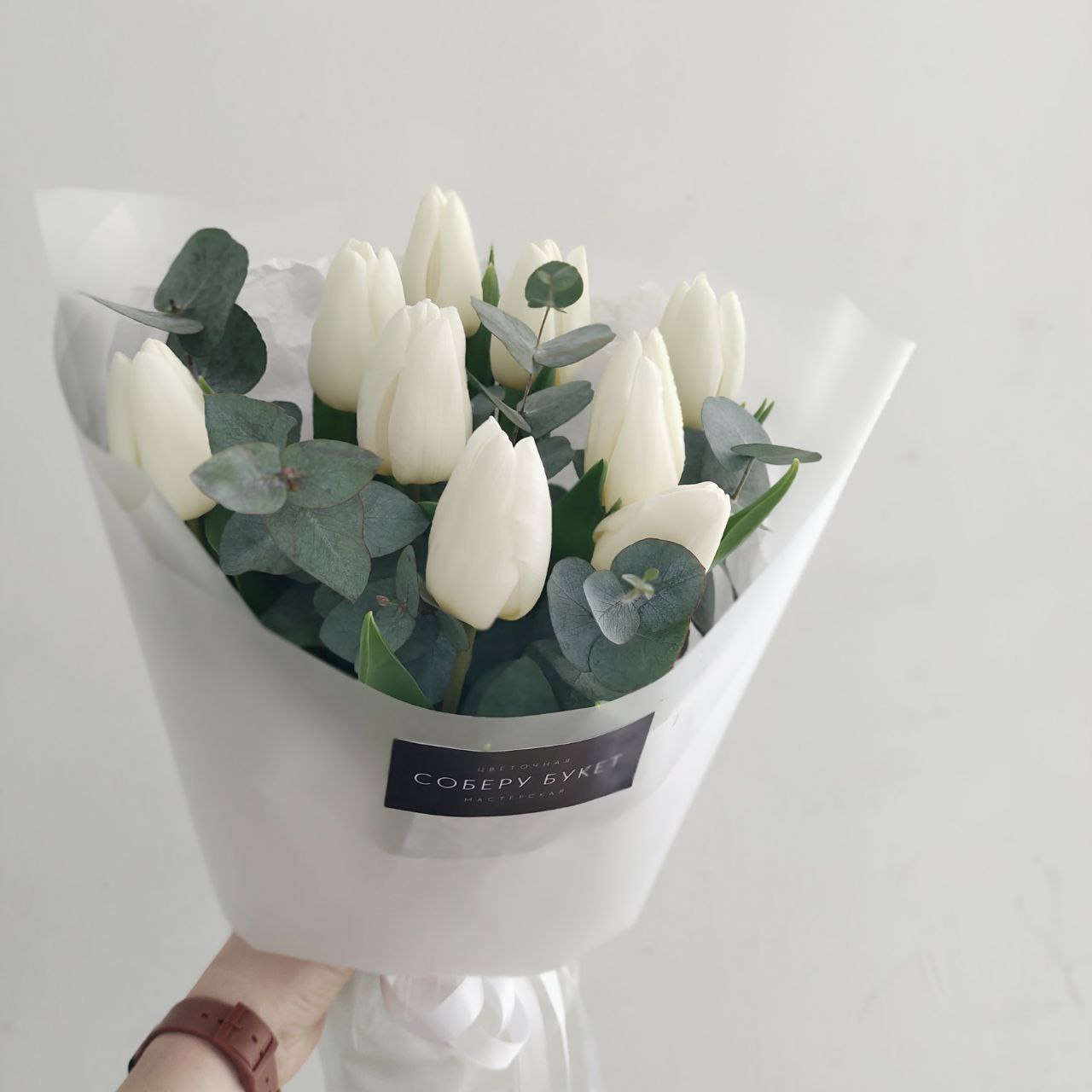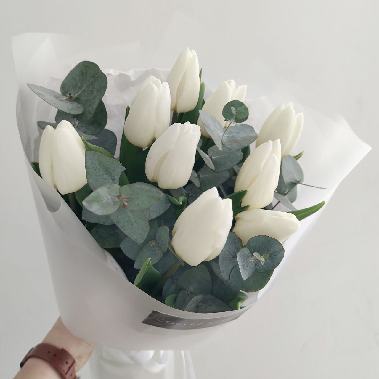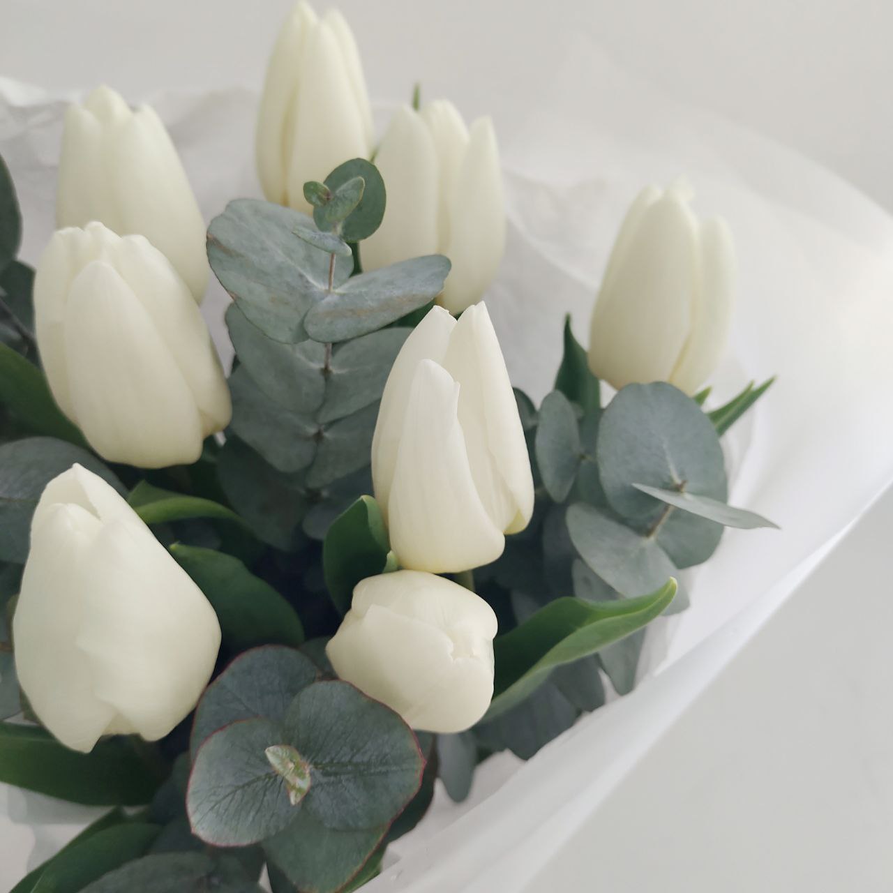 Нежный букет из девяти белых тюльпанов – символ начала весны и искренних чувств! Элегантные линии бутонов подчеркнуты нежными оттенками зелени эвкалипта, который добавляет композиции свежести и утонченности.
