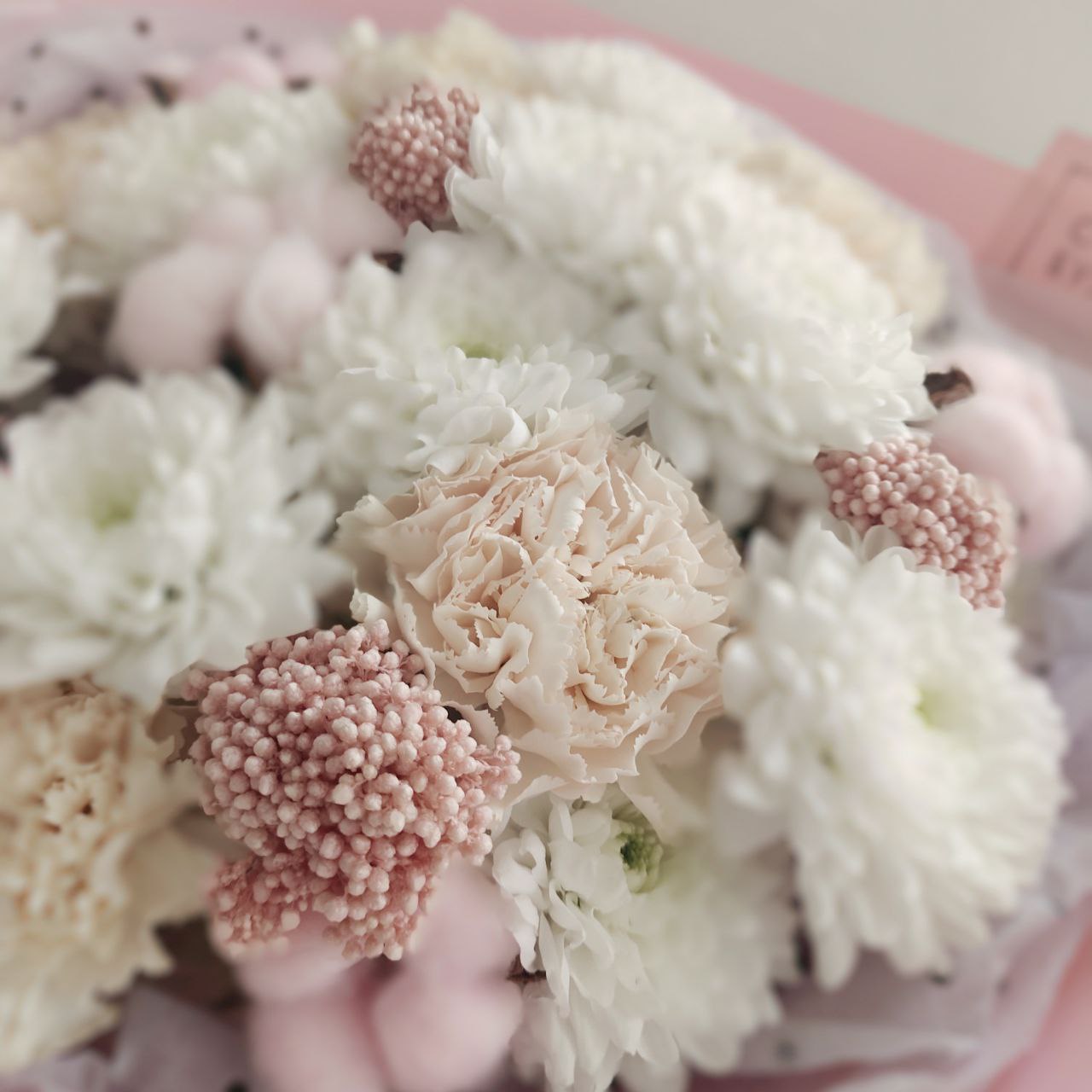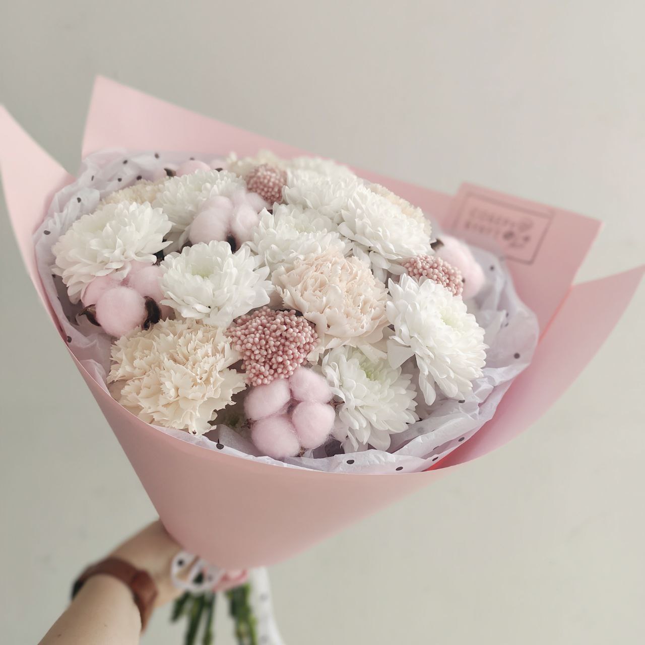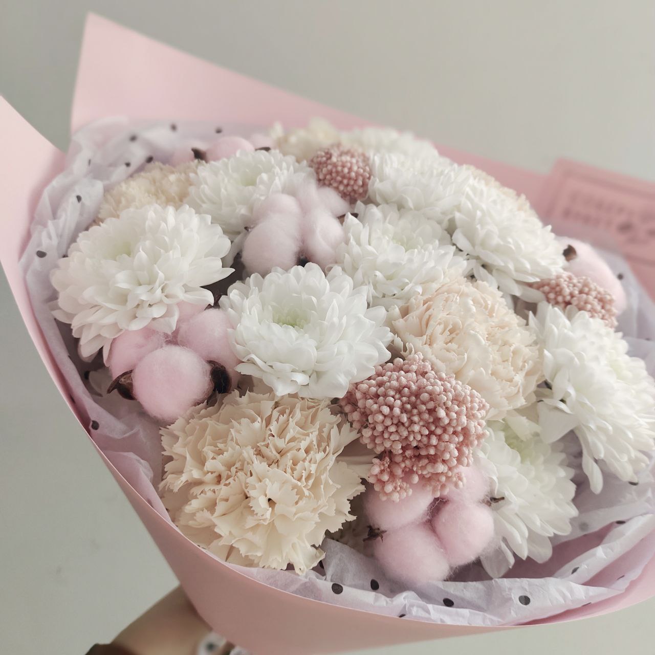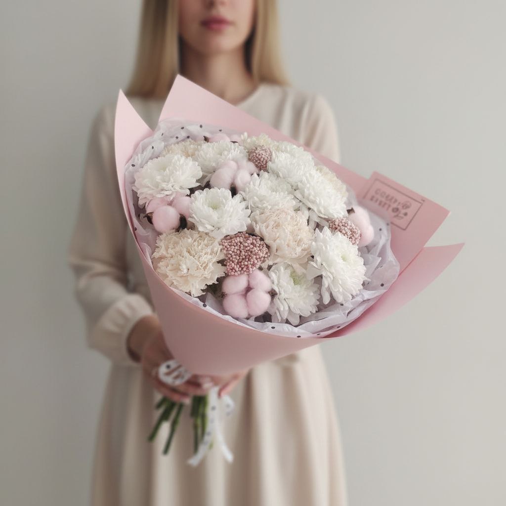 Этот элегантный букет станет великолепным подарком для вашей любимых! Нежные кремово-белые оттенки цветов гармонично сочетаются с мягкостью хлопка, создавая ощущение природной красоты и уюта. Такой подарок непременно выразит вашу любовь и заботу, став прекрасным украшением любого интерьера. Порадуйте свою маму этой очаровательной композицией, которая будет радовать ее долгое время!